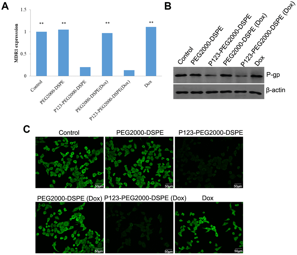 MCF-7R cells were treated with PBS (control), PEG2000-DSPE, P123-PEG2000-DSPE, Dox, PEG2000-DSPE (Dox) and P123-PEG2000-DSPE (Dox), respectively, and then the mRNA and protein expression levels of P-gp were detected. The results of qRT-PCR found similar mRNA levels of MDR1 in control cells as well as cells treated with PEG2000-DSPE, free Dox and PEG2000-DSPE (Dox) (Figure 5A). However, compared these cells, the mRNA level of MDR1 was significantly decreased in cells with P123-PEG2000-DSPE and P123-PEG2000-DSPE (Dox), especially in cells with P123-PEG2000-DSPE (Dox) (Figure 5A). Consistently, both western blotting (Figure 5B) and immunofluorescence (Figure 5C) revealed similar expression trend of P-gp protein when MCF-7R cells underwent the above treatments.