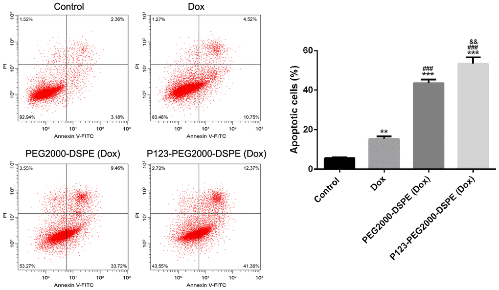 Flow cytometry analysis revealed that the free Dox significantly increased the rate of apoptotic cells compared with control cells; meanwhile, compared with cells with free Dox, cells treated with PEG2000-DSPE (Dox) showed the increased rate of apoptotic cells, and then P123-PEG2000-DSPE (Dox) treatment further increased the rate of apoptotic cells (p < 0.01, Figure 6).