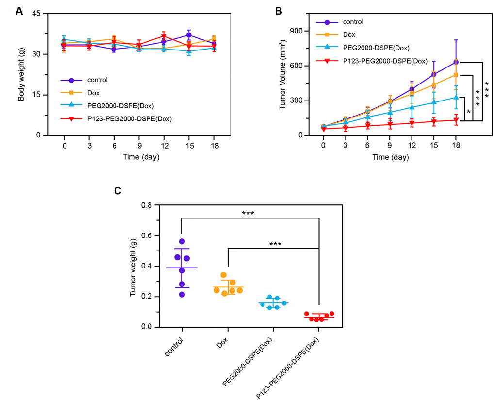 Approval from the local animal Ethics Committee of the animal laboratory center was obtained prior to experiments. Healthy female drug-resistant BC C57 mice (weighting 18-22 g, purchased from Charles River, Beijing, China) were used for the following experiments after one week of acclimation. Drug-resistant BC mice were treated with saline solution (control group, n = 8), Dox (10 mg/kg, Dox group, n = 8), PEG200-DSPE (Dox) (containing 10 mg/kg of Dox, PEG200-DSPE (Dox) group, n = 8), and P123-PEG200-DSPE (Dox) (containing 10 mg/kg of Dox, P123-PEG200-DSPE (Dox) group, n = 8) via rapid tail vein injection, respectively. The body weight, and tumor volume of mice were monitored every three days for 18 days. On day 18, mice were euthanized, and the tumor was resected for the measurement of tumor weight.