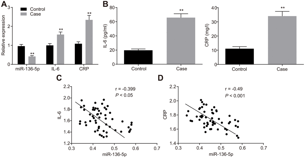 A total of 2 mL peripheral blood was drawn while patients were on empty stomach in the morning on the day of treatment. The blood samples were added with anticoagulant heparin, and centrifuged at 8000 r/min at 4°C for 10 minutes to collect the plasma and red blood cells, followed by the extraction of RNA from total red cells. The expression levels of miR-136-5p, IL-6, and CRP in the cells were detected using RT-qPCR. The levels of IL-6 and CRP in plasma were measured using ELISA kits (Shanghai Bogu biotech, Co, Ltd, Shanghai, China) [39].