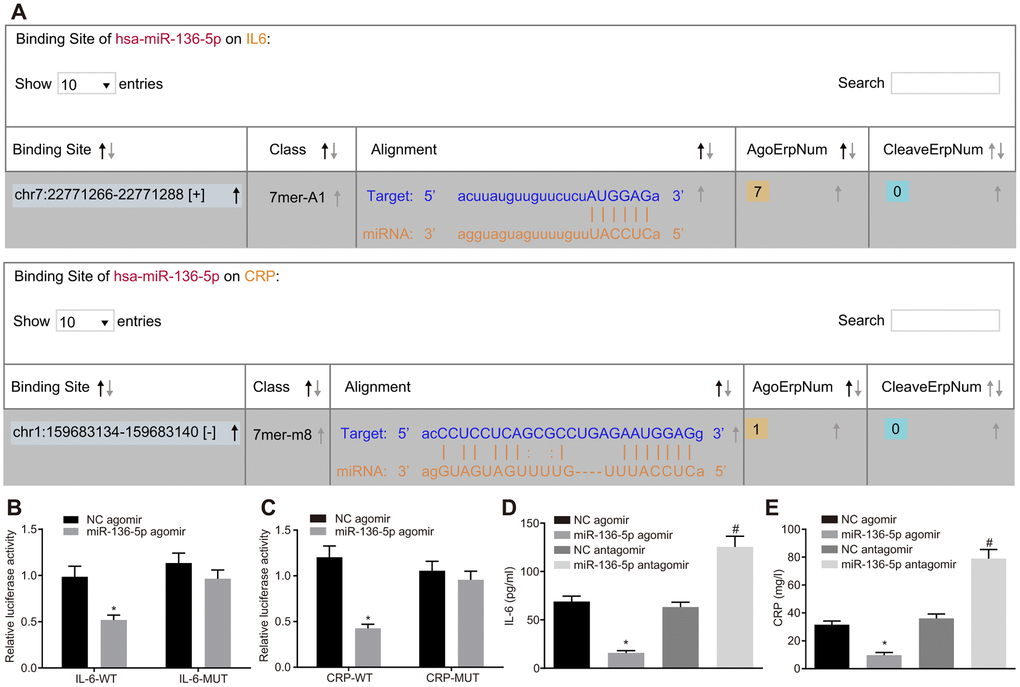 Using the web-based bioinformatic resource ‘starBase’ the existence of binding sites between miR-136-5p and IL-6 as well as between miR-136-5p and CRP was predicted (Figure 2A). The recombinant plasmid of the luciferase reporter gene was obtained through the insertion of IL-6 mRNA 3’untranslated region (UTR) or CRP mRNA 3’UTR in order to verify the status of their interaction. Dual-luciferase reporter gene assay results displayed that luciferase activities of IL-6-wild type (Wt) and CRP-Wt were relatively lower (p < 0.05) while those of IL-6-Mutant (Mut) and CRP-Mut did not differ significantly following treatment with miR-136-5p agomir (p > 0.05) (Figure 2B, 2C). In addition, ELISA results indicated that levels of IL-6 and CRP were coherently reduced in the culture medium supernatant of HUVECs treated with miR-136-5p agomir. However, levels of IL-6 and CRP were significantly increased in cells treated with miR-136-5p antagomir (Figure 2D, 2E). In sum, these results showed that miR-136-5p targeted IL-6 and CRP and downregulated their expression.