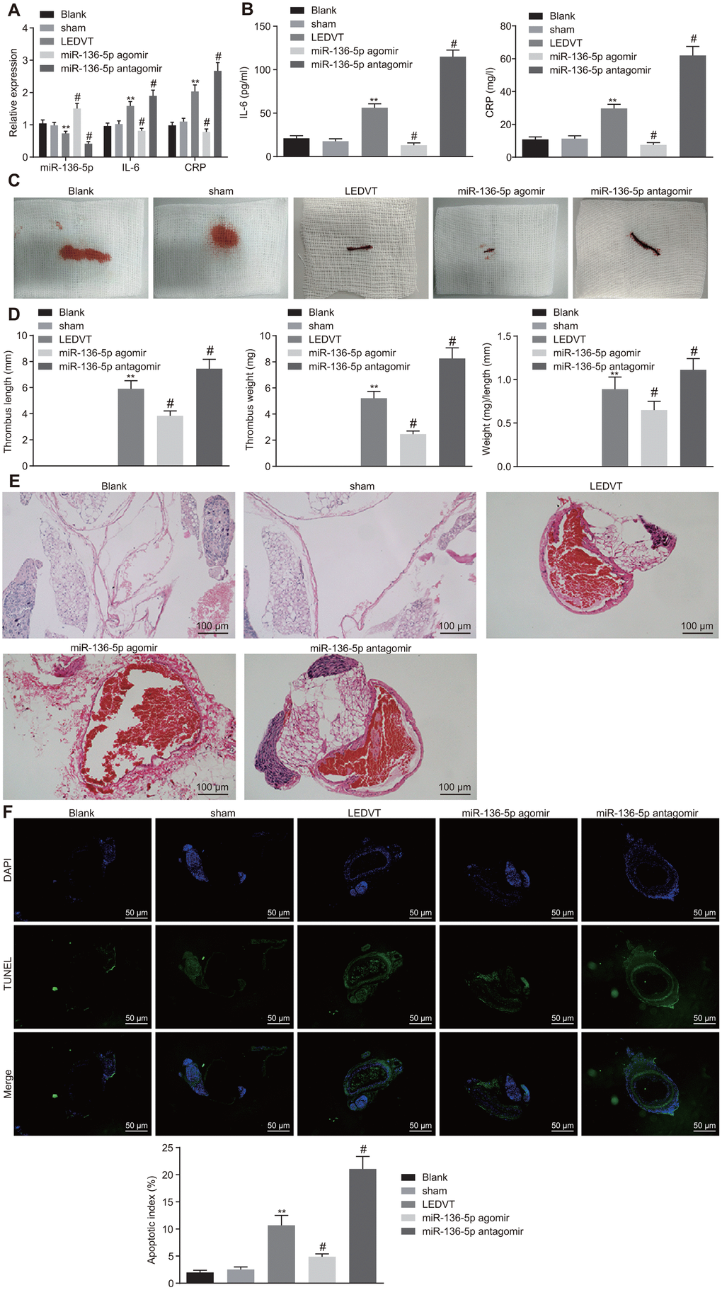 Following the determination of the correlation of miR-136-5p with IL-6 and CRP, the focus of the study was shifted to the effects of miR-136-5p on acute LEDVT. The results of RT-qPCR, which were used to evaluate the expression of miR-136-5p, IL-6, and CRP in vein tissues, revealed that the expression levels of miR-136-5p, IL-6, and CRP in vein tissues did not fluctuate greatly in rats injected with normal saline alone and in sham-operated rats. In comparison to the rats that underwent acute LEDVT modeling, the expression levels of miR-136-5p were significantly higher while those of IL-6 and CRP were remarkably lower in the rats injected with miR-136-5p agomir. The opposite results were noted in rats injected with miR-136-5p antagomir (Figure 3A). The ELISA assays displayed that the levels of IL-6 and CRP were markedly downregulated in miR-136-5p agomir-treated rats but were significantly upregulated in miR-136-5p antagomir-treated rats (Figure 3B). In addition, rats injected with normal saline alone and sham-operated rats showed IVC walls that were unobstructed. Moreover, in these rats, the bloodstream was visible and apparent inside the vascular lumen, and the vessel diameters were uniform with thin, soft, and elastic vessel walls and without any evident thrombus in vessels. However, in rats that underwent acute LEDVT modeling and in rats injected with miR-136-5p agomir or miR-136-5p antagomir, the IVC presented different extremes of edema and venous walls were seen as dark purple with venous thrombus (Figure 3C). The length and weight of the venous thrombus were considered fundamental indices for the purpose of quantifying the degree of venous thrombosis. As illustrated in Figure 3D, no venous thrombus was observed in rats injected with normal saline alone and sham-operated rats. When compared with the acute LEDVT model rats, the length, weight, and the ratio of weight to length of the venous thrombus were found significantly reduced in rats treated with miR-136-5p agomir (p < 0.05), but significantly elevated in rats treated with miR-136-5p antagomir (p < 0.05), implying that the upregulation of miR-136-5p had the ability to decrease the length and weight of the venous thrombus. Hematoxylin-eosin (HE) staining was conducted for pathological analysis of the vein tissues and the results revealed no venous thrombus in rats solely injected with normal saline and sham-operated rats. However, incomplete venous thrombus was observed in miR-136-5p agomir-treated rats, and complete venous thrombus was noted in both miR-136-5p antagomir-treated rats and acute LEDVT model rats (Figure 3E). Following this section of the experiment, terminal deoxynucleotidyl transferase-mediated dUTP-biotin nick end labeling (TUNEL) assay was performed in order to detect the effects of miR-136-5p on the apoptosis of endothelial cells in the femoral vein. The results indicated that endothelial cell apoptosis did not differ greatly in rats treated solely with normal saline and sham-operated rats. In contrast to the acute LEDVT model rats, the rats treated with miR-136-5p agomir demonstrated significantly attenuated endothelial cell apoptosis whereas rats treated with miR-136-5p antagomir presented significantly enhanced endothelial cell apoptosis (p < 0.05) (Figure 3F). These results supported the notion that the upregulation of miR-136-5p could possibly inhibit the progression of acute LEDVT.