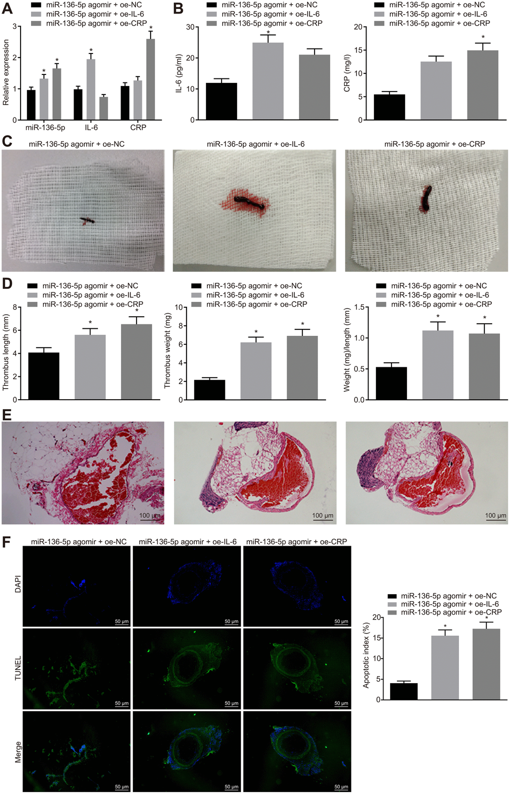 Thereafter, a series of assays were employed to investigate the regulatory mechanisms involving IL-6 and CRP in miR-136-5p effects on acute LEDVT in the different treatment groups of rats. Initially, mRNA and protein expression levels of IL-6 and CRP in rat vein tissues were detected using RT-qPCR (Figure 4A) and ELISA (Figure 4B). The results indicated that compared with the rats treated with both miR-136-5p agomir and overexpression vector negative control (oe-NC), the mRNA and protein expression levels of IL-6 were significantly higher in rats treated with both miR-136-5p agomir and oe-IL-6, and similarly, CRP levels were also clearly elevated in rats treated with both miR-136-5p agomir and oe-CRP. However, considering the changes of acute LEDVT in rats after different treatments, it was noted that the length, weight, and the ratio of weight to length of the venous thrombus were elevated following treatments with combination of miR-136-5p agomir and oe-IL-6 or combination of miR-136-5p agomir and oe-CRP in comparison to that with the combination of miR-136-5p agomir and oe-NC (all p < 0.05; Figure 4C, 4D). Subsequently, pathological changes in vein tissues in rats that underwent different treatments were analyzed using HE staining. Combined treatment of miR-136-5p agomir and oe-IL-6 or combined treatment of miR-136-5p agomir and oe-CRP led to complete venous thrombosis versus the combined treatment of miR-136-5p agomir and oe-NC (Figure 4E). The TUNEL assay for endothelial cell apoptosis detection showed that the apoptosis of endothelial cells was markedly enhanced in response to the combined treatment of miR-136-5p agomir and oe-IL-6 or the combined treatment of miR-136-5p agomir and oe-CRP in contrast to the combined treatment of miR-136-5p agomir and oe-NC (p < 0.05) (Figure 4F). These results supported a conclusion that IL-6 and CRP could reverse the mitigative effects of miR-136-5p elevation on acute LEDVT.