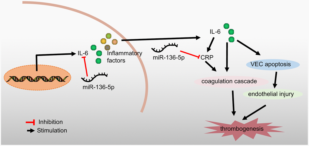 In conclusion, the current study demonstrated that overexpression of miR-136-5p could bind to and negatively regulate both IL-6 and CRP to ameliorate the development of acute LEDVT (Figure 6). This study provides a theoretical basis for a deeper understanding of the mechanisms underlying acute LEDVT, thus enabling the development of new therapeutic strategies for the prevention and treatment of this disease. However, in order to explore other miRNAs implicated in the development of acute LEDVT as well as the other possible target genes of miR-136-5p, further studies are essential and these may validate current findings to further the translational potential of this direction.