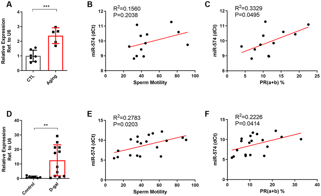 In our study, we confirmed the increase of miR-574 in the sperm of two aging mouse models and observed a negative relationship between sperm motility and miR-574. However, no such trend was observed in the clinical semen samples, suggesting that confounding factors other than age affected the detection. The cutoff for advanced paternal age used here is over 40 years old at the time of conception [32], and further study should be conducted with more stratification by age and should be performed on extensive semen samples in addition to the men attending infertility clinics. Herein, we proved the important role of miR-574 on sperm function in aging males, but the knockout or knock-in mice should be established to test the hypothesis in further investigations. Moreover, we observed that the embryos microinjected with miR-574 mimic showed a drop trend of embryonic development, with no statistical significance. Further study is required to examine the effect of pools of multiple miRNAs on early embryonic development.
