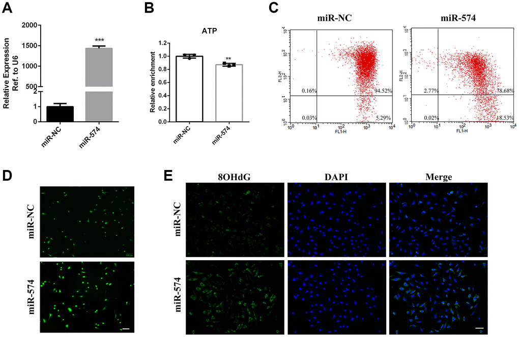 To identify the potential function of miR-574, we overexpressed miR-574 in GC2 cells by transfection of miR-574 mimics (Figure 3A). Then, we measured GC2 cellular ATP levels and found that miR-574 could decrease ATP production in GC2 cells (Figure 3B). Furthermore, we examined the effect of miR-574 on mitochondrial membrane potential (MMP). Flow cytometry results showed that miR-574 increased the ratio of Q4 district/ Q2 district compared with that in the control group (Figure 3C), indicating that miR-574 might cause mitochondrial membrane potential abnormalities. Moreover, ROS and DNA damage levels (marked by 8-OHdG) were detected in GC2 cells transfected with miR-574. Our results demonstrated that miR-574 significantly increased cellular ROS and DNA damage levels (Figure 3D–3E). Together, these results indicated that miR-574 could impair mitochondrial function and reduce cellular ATP production.