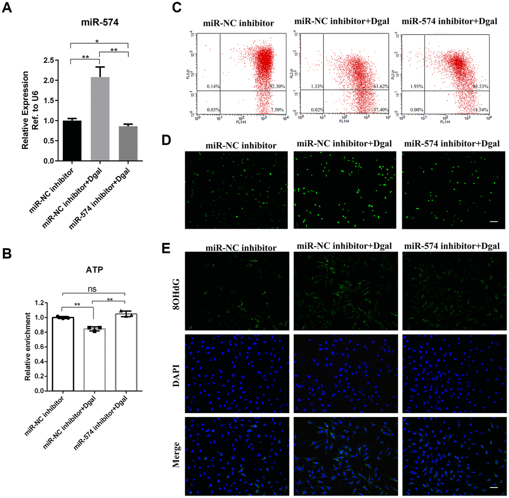 We treated GC2 cells with D-gal and found that D-gal increased the expression of miR-574. To further explore the role of miR-574, we reduced the expression of miR-574 in GC2 cells by transfection with a miR-574 inhibitor (Figure 4A). Then, we measured the cellular ATP levels and found that D-gal decreased the ATP production in GC2 cells and that the miR-574 inhibitor alleviated this decrease (Figure 4B). Furthermore, flow cytometry results showed that D-gal increased the ratio of Q4 district/ Q2 district and that the miR-574 inhibitor mitigated this effect (Figure 4C). Moreover, ROS and DNA damage levels were detected in GC2 cells treated with D-gal or miR-574 inhibitor. We observed that D-gal significantly increased cellular ROS and DNA damage levels, and the miR-574 inhibitor could relieve the increase (Figure 4D–4E). Overall, these results indicated that miR-574 depletion could relieve mitochondrial dysfunction and increase cellular ATP production.