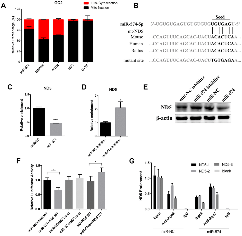 Previous studies have demonstrated that many miRNAs and the core component of RISC, Ago2/Ago3, are found within the mitochondria and miRNAs may also translocate to the mitochondrial matrix to regulate mitochondrial gene expression [25]. We then isolated the mitochondrial fraction and cytoplasmic fraction and determined the miR-574 expression. We observed that miR-574 was expressed in the mitochondrial fraction, indicating that miR-574 may translocate to the mitochondria and regulate mitochondrial gene expression (Figure 5A). We predicted the target genes of miR-574 within the mitochondrial pathway by the bioinformatics tool RNA22 and found an evolutionarily conserved target site in the mt-ND5 gene (Figure 5B). We next detected the mt-ND5 expression in GC2 cells transfected with miR-574 mimics or inhibitor, and found that mt-ND5 mRNA and protein expression levels were significantly lower in cells transfected with miR-574 mimic and higher in cells transfected with miR-574 inhibitor than in cells transfected with negative control (Figure 5C–5E). To verify the relationship between miR-574 and mt-ND5, we constructed luciferase reporters containing either the wild-type (WT) or mutated (Mut) miR-574 binding sites (seed sequence) in mt-ND5 (Figure 5B). Overexpression of the miR-574 mimic reduced the luciferase activity of the WT reporter vector but not that of the mutated reporter vector (Figure 5F). It is known that miRNAs bind to their targets and cause translational repression and/or RNA degradation in an Ago2-dependent manner. To determine whether mt-ND5 is regulated by miR-574 in this manner, we conducted anti-Ago2 RIP in GC2 cells transiently overexpressing miR-574. The mt-ND5 pulldown by Ago2 was more highly enriched in miR-574-transfected cells, suggesting that miR-574 directly targets mt-ND5 (Figure 5G). Moreover, we observed that knockdown of mt-ND5 would relieve the increasing trend of cellular ATP production induced by the miR-574 inhibitor in D-gal-treated GC2 cells (Supplementary Figure 3A). Furthermore, we detected the mt-ND5 expression in the sperm of the two aging models, and found that mt-ND5 was significantly downregulated in the sperm of the aging group (Supplementary Figure 3B). Together, these results indicated that miR-574 regulated the mitochondrial function by directly targeting mt-ND5.