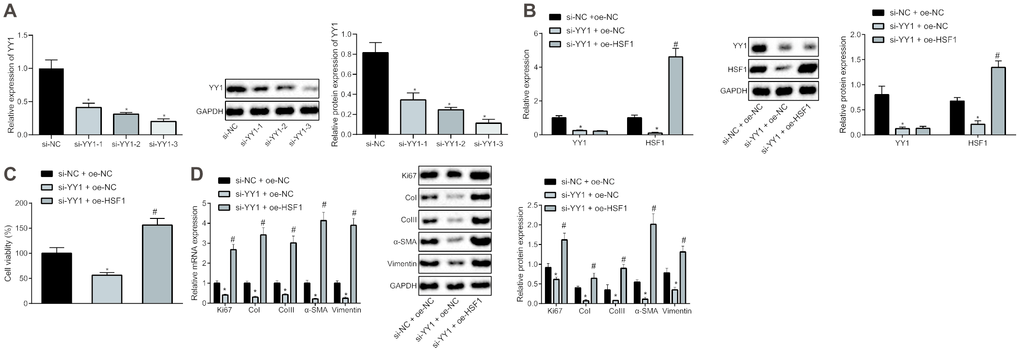 To explore the correlation between YY1 and HSF1, siRNAs targeting YY1 (si-YY1) were designed to knock down YY1 and HSF1 overexpression plasmid (oe-HSF1) was co-transfected to the HEPFs treated with si-YY1. si-YY1-3 with the best silencing efficiency was firstly determined by reverse transcription-quantitative polymerase chain reaction (RT-qPCR) and western blot analysis (Figure 1A). The overexpression efficiency of HSF1 attained the requirements for further experiments (Figure 1B). Besides, YY1 silencing reduced the expression of HSF1, suggesting a positive regulatory effect of YY1 on HSF1. In the process of pulmonary fibrosis, a critical phenomenon is the proliferation of fibroblasts and their fibrogenic transformation into myofibroblasts. Therefore, the viability of human embryonic pulmonary fibroblasts (HEPFs) was assessed by CCK8 experiments after YY1 silencing and/or HSF1 overexpression (Figure 1C), which showed that silencing YY1 could inhibit the viability of HEPFs, while overexpression of HSF1 had the opposite effect. Subsequently, the expression of cell proliferation marker Ki67 and fibrosis biomarkers CoI, CoIII, α-SMA and vimentin was measured by RT-qPCR and western blot analysis (Figure 1D). The results indicated that silencing YY1 could suppress the expression of Ki67 and that of fibrosis biomarkers, while overexpression of HSF1 had opposite effects. Hence, YY1 silencing potentially impeded the proliferation and fibrogenic transformation of HEPFs by inhibiting HSF1.