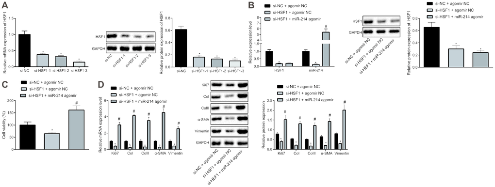 With an attempt to further explore the interaction between HSF1 and miR-214, HSF1 was silenced in HEPFs with siRNAs and miR-214 was overexpressed using miR-214 agomir. si-HSF1-3 proved to have the best silencing efficiency as shown by RT-qPCR and western blot analysis (Figure 2A). Then expression of miR-214 and HSF1 mRNA was measured by RT-qPCR, and protein expression of HSF1 by western blot analysis (Figure 2B). The results showed that the overexpression and silencing efficiency met the requirements for further experiments and that HSF1 silencing contributed to down-regulation of miR-214 expression. The viability of HEPFs in response to gain-/loss-of-function of HSF1 and miR-214 was assessed by CCK8 experiments (Figure 2C), which showed that silencing HSF1 could inhibit the viability of HEPFs, while overexpression of miR-214 could reverse this inhibitory effect on cell viability. The expression of cell proliferation marker Ki67 and fibrosis biomarkers CoI, CoIII, α-SMA and vimentin was measured by RT-qPCR and western blot analysis (Figure 2D), showing that silencing HSF1 reduced the expression of Ki67 and fibrosis biomarkers. However, these reductions were counteracted by overexpression of miR-214. In brief, HSF1 upregulated the expression of miR-214. Silencing HSF1 could suppress the fibrogenic transformation of HEPFs into myofibroblasts through down-regulation of miR-214.