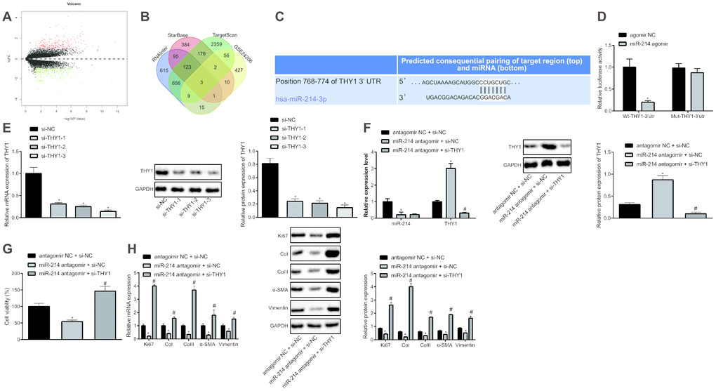 Further, we analyzed the GSE24206 microarray to screen out the differentially expressed genes (DEGs) in IPF, which yielded 523 DEGs, of which 252 were up-regulated genes and 271 were down-regulated genes (Figure 3A). The target genes of miR-214 were predicted by the TargetScan, miRDB, and RNAInter databases, which revealed three genes (UCP2, THY1, errfi1) from intersection analysis (Figure 3B). Among the three, THY1 has been reported previously to inhibit IPF [11], and was therefore selected as the main research object. The possible binding site of miR-214 on THY1 was predicted by TargetScan database (Figure 3C). To validate this predicted binding relationship, dual-luciferase reporter assay was conducted to detect the luciferase activity of Wt-THY1-3’UTR and Mut-THY1-3’UTR that respectively co-transfected with agomir NC and miR-214 agomir in HEPFs (Figure 3D). The results showed that miR-214 could specifically target THY1 and down-regulate the luciferase activity of Wt-THY1-3’UTR. Therefore, we speculated that miR-214 might inhibit THY1 to mediate pulmonary fibrosis, and carried out further experiments to test this hypothesis.