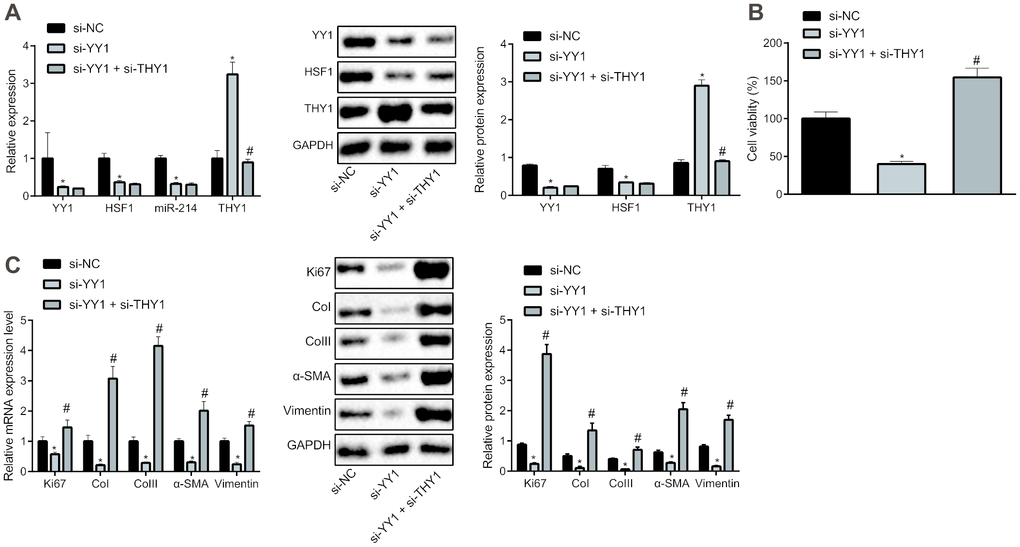Based on the aforementioned findings, we attempted to verify the effect of the YY1/HSF1/miR-214/THY1 axis on the fibrogenic transformation of HEPFs. After silencing YY1 alone or together with THY1 in HEPFs, expression of YY1, HSF1, miR-214 and THY1 was assessed by RT-qPCR, and the protein expression was measured by western blot analysis (Figure 4A). The results showed that, compared with the cells transfected with si-NC, the expression of YY1, HSF1 and miR-214 in cells transfected with si-YY1 was significantly decreased, while the expression of THY1 was noticeably increased. Meanwhile, expression of YY1, HSF1 and miR-214 showed no significant change, but the expression of THY1 was notably reduced in cells treated with si-YY1 and si-THY1 compared with the cells transfected with si-YY1. Hence, YY1 could down-regulate the expression of THY1. Then, the viability of HEPFs in response to YY1 silencing alone or in combination with THY1 was measured by CCK8 experiments (Figure 4B). Results suggested that silencing YY1 could inhibit the viability of HEPFs, which was rescued by silencing THY1 simultaneously. Additional RT-qPCR and western blot analysis data (Figure 4C) revealed that silencing YY1 caused reductions in the expression of Ki67 and that of fibrosis biomarkers, while silencing THY1 could attenuate hose reductions. These results showed that the proliferation and fibrogenic transformation processes of HEPFs could be mediated through YY1/HSF1/miR-214/THY1 axis.