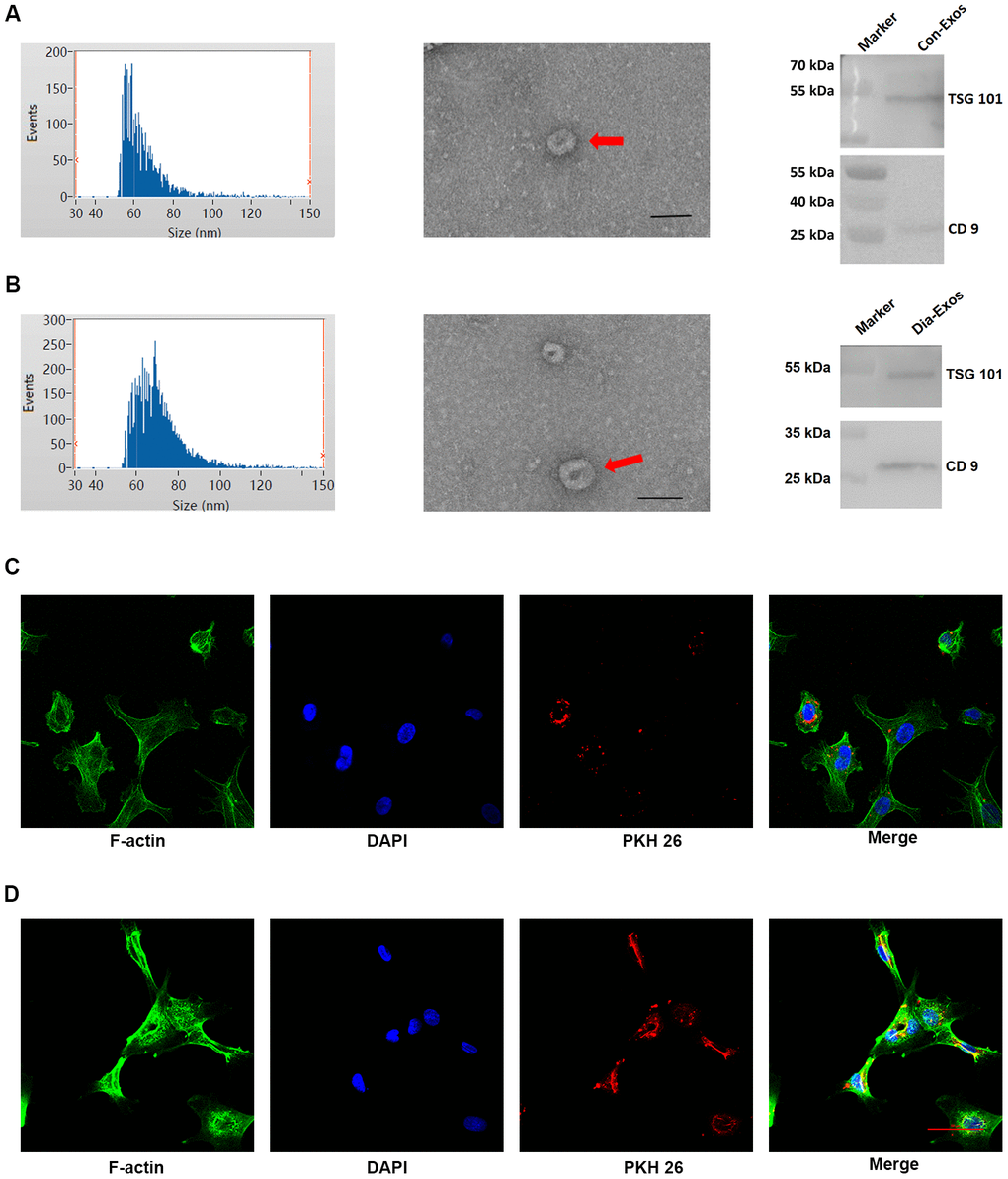 We next assessed the ability of human umbilical vein endothelial cells (HUVECs) to take up the circulating exosomes in vitro. Con-Exos or Dia-Exos were labeled with PKH26 dye and added to the HUVEC culture medium. The results suggested that HUVECs could take up both Con-Exos and Dia-Exos (Figure 1C and 1D). Thus, the nanosized particles isolated from blood were exosomes that could be taken up by HUVECs.