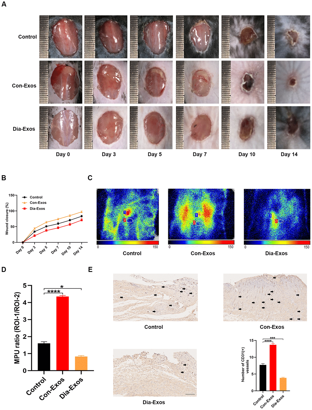 Next, we evaluated the influence of Dia-Exos on wound repair by generating full-thickness cutaneous wounds on the backs of mice and locally injecting them with equal volumes of either phosphate-buffered saline (PBS), Con-Exos or Dia-Exos. The general appearance of the wounds indicated that the wound closure rate was significantly slower in the Dia-Exos group than in the Con-Exos group (Figure 2A and 2B). To assess the blood perfusion of the injured area, we performed small animal doppler detection. The results at 10 days post-treatment demonstrated that the mean perfusion units (MPU) ratio at the wound site was lower in the Dia-Exos group than in the Con-Exos group (Figure 2C and 2D). Immunohistochemistry was performed to assess CD31 expression as a marker of newly generated vessels at the wound site. Dia-Exos were found to impair angiogenesis (Figure 2E). These results indicated that Dia-Exos suppressed diabetic wound repair.