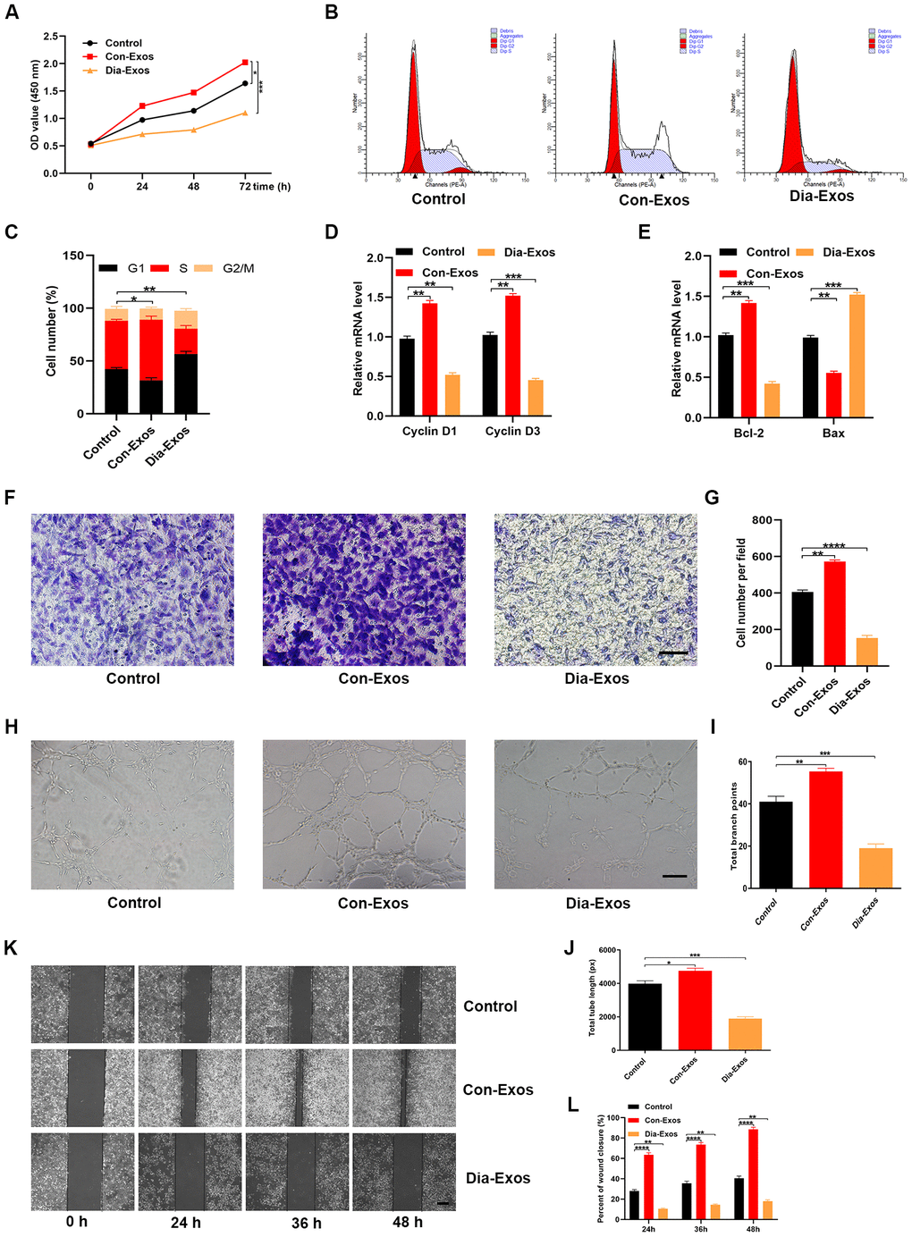 We then assessed the effects of Dia-Exos on HUVEC functionality. First, we used a Cell Counting Kit-8 (CCK-8) assay to assess cell proliferation. HUVECs treated with Dia-Exos exhibited a significantly lower extent of proliferation than those treated with Con-Exos (Figure 3A). Flow cytometry was then used to quantify the cell cycle distribution, and the proportion of cells entering S phase was found to be significantly reduced following Dia-Exos treatment (Figure 3B and 3C). The proliferation-related genes Cyclin D1 and Cyclin D3 were also downregulated in HUVECs treated with Dia-Exos (Figure 3D). Consistently, Bcl-2 expression was reduced and Bax expression was elevated following Dia-Exos treatment (Figure 3E).