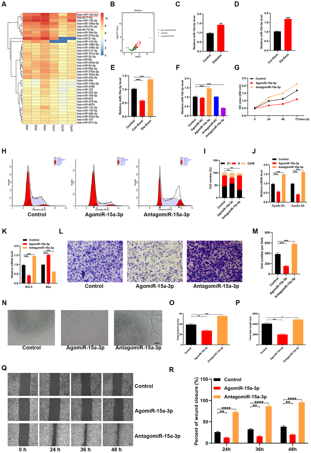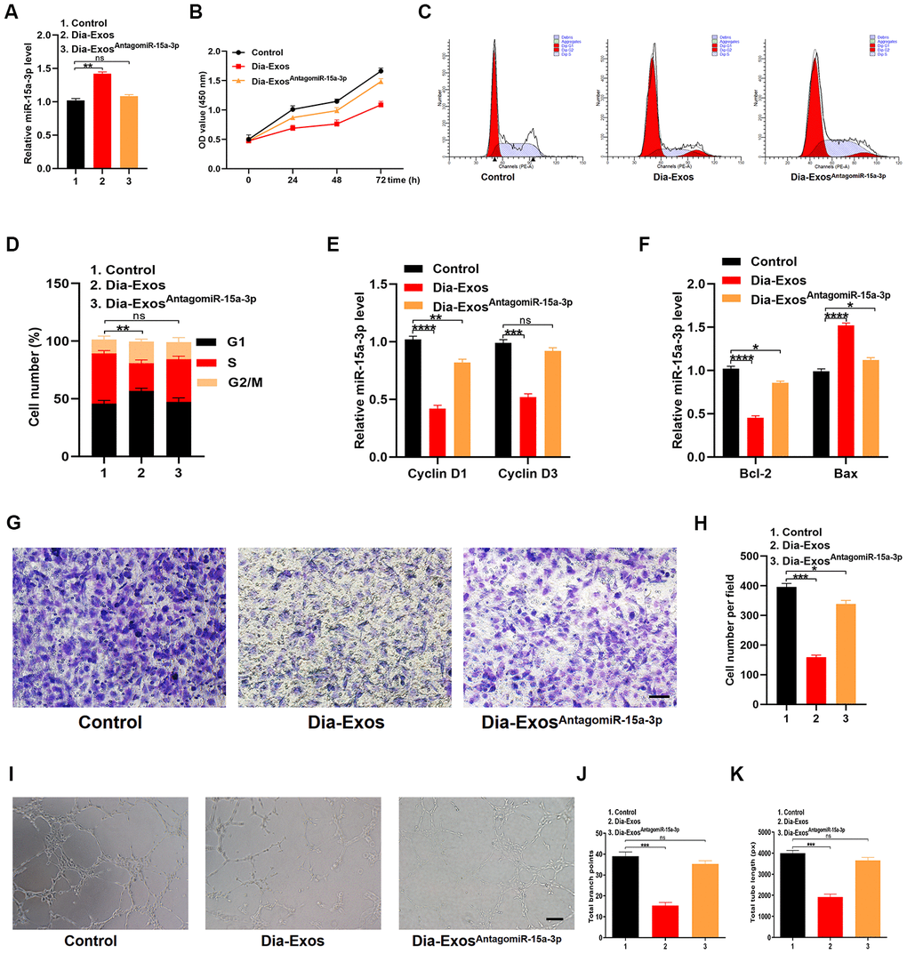 HUVECs were randomly divided into three groups: the PBS group (Control), the Dia-Exos group and the Dia-ExosAntagomiR-15a-3p group (Dia-Exos combined with the miR-15a-3p antagonist). We found that miR-15a-3p levels were significantly lower in the Dia-ExosAntagomiR-15a-3p group than in the other groups (Figure 5A). A CCK-8 cell proliferation assay indicated that knocking down miR-15a-3p partially restored the proliferation of HUVECs treated with Dia-Exos (Figure 5B). Furthermore, flow cytometry analysis of the cell cycle distribution demonstrated that the proportion of cells entering S phase was partially restored by Dia-ExosAntagomiR-15a-3p treatment compared with Dia-Exos treatment (Figure 5C and 5D). Moreover, qRT-PCR analysis indicated that Cyclin D1 and Cyclin D3 levels were recovered in HUVECs treated with Dia-ExosAntagomiR-15a-3p (Figure 5E), as were Bcl-2 and Bax levels (Figure 5F). A Transwell migration assay revealed that HUVEC migration was partly restored by Dia-ExosAntagomiR-15a-3p treatment compared with Dia-Exos treatment (Figure 5G and 5H). Angiogenesis was assessed through a tube formation assay, and was found to be significantly induced following Dia-ExosAntagomiR-15a-3p treatment compared with Dia-Exos treatment (Figure 5I–5K).