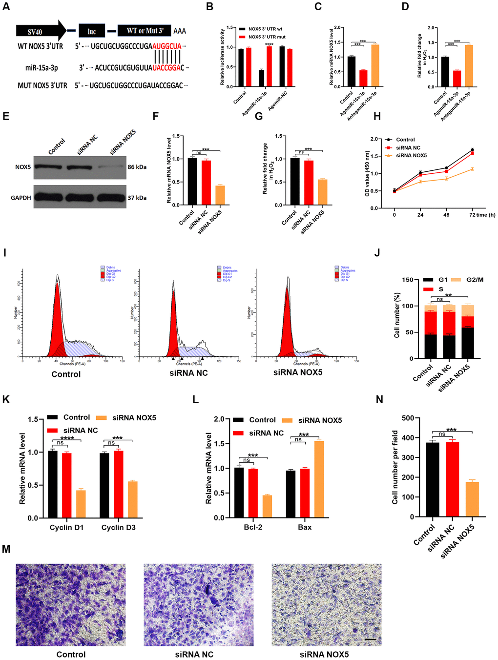 Next, we transfected HUVECs with siRNA specific for NOX5 to assess whether HUVEC functionality depended on NOX5. Both NOX5 expression and ROS release were significantly reduced in NOX5 siRNA-treated cells (Figure 7E–7G). A CCK-8 cell proliferation assay demonstrated that NOX5 siRNA inhibited HUVEC proliferation (Figure 7H). Flow cytometry analysis of the cell cycle distribution indicated that the proportion of cells entering S phase was significantly reduced following NOX5 siRNA treatment (Figure 7I and 7J). Similarly, qRT-PCR analysis revealed that Cyclin D1 and Cyclin D3 levels were reduced in HUVECs treated with NOX5 siRNA (Figure 7K). Consistently, Bcl-2 levels were reduced and Bax levels were elevated following NOX5 siRNA treatment (Figure 7L). A Transwell migration assay demonstrated that NOX5 siRNA treatment impaired the migration ability of HUVECs (Figure 7M and 7N). These results suggested that miR-15a-3p inhibited wound repair by downregulating the NOX5/ROS signaling pathway.