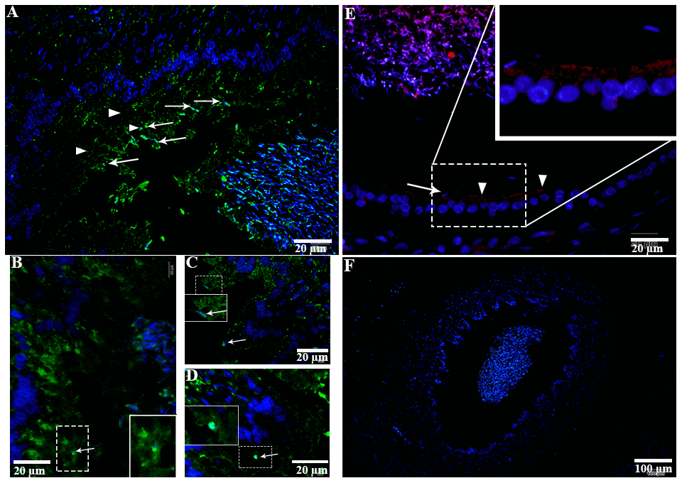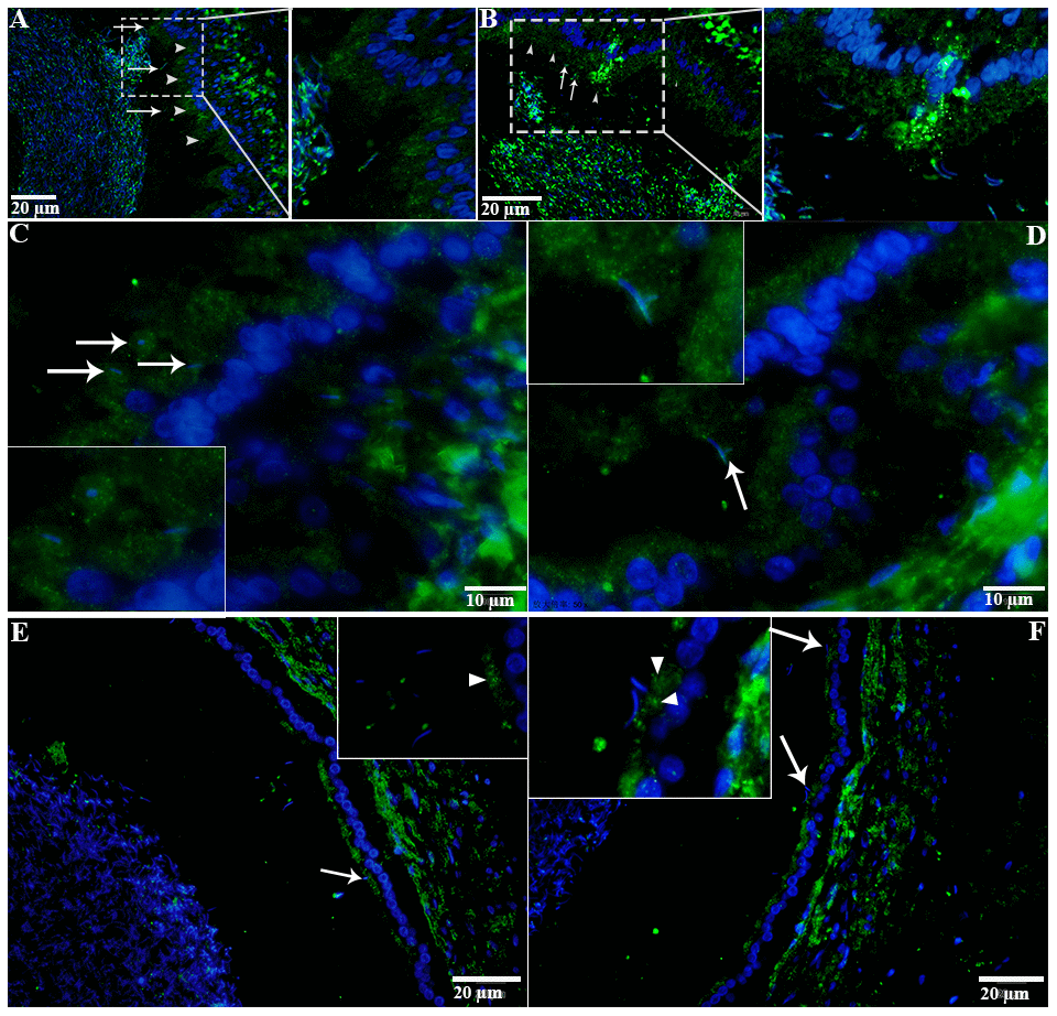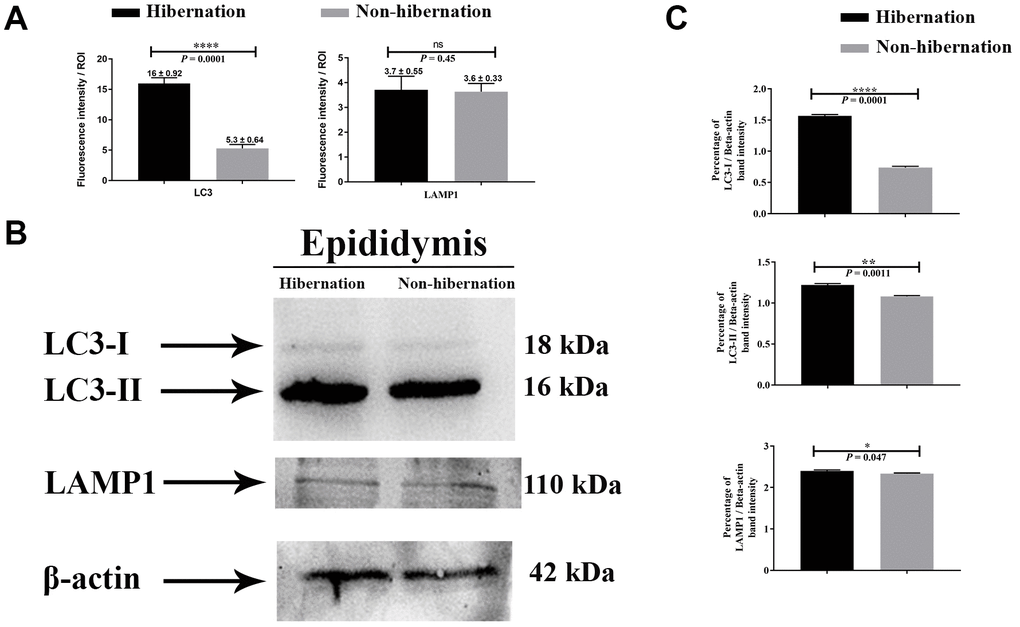 H&E staining revealed the transit passage of spermatozoa, that develop at the seminiferous tubule, travel via the rete testis to the ductuli efferentes and are stored in the lumen of the epididymis during hibernation (Figure 1A–1C) and non-hibernation (Figure 1D). Higher magnification showed that numerous spermatozoa were in-contact with the epididymal epithelia (Figure 1B), whereas few spermatozoa were observed within the cytoplasm of the epididymal epithelia (Figure 1C). These spermatozoa were believed to be residual or abnormal as they were phagocytosed by the epididymal epithelia. Whereas during non-hibernation, we observed similar interaction of spermatozoa with apices of epididymal epithelial (Figure 1D). To investigate the spermiophagy within the epididymal epithelia of the turtle, we used immunofluorescence to determine the expression of LAMP1, which is a key lysosomal marker. It was observed that, LAMP1 strongly localized within the supranuclear cytoplasm of the epididymal epithelia and in the luminal spermatozoa during the hibernation (Figure 2A). Detailed observations during hibernation suggest that, LAMP1 is strongly expressed around the spermatozoa which is observed within the apical epididymal epithelium (Figure 2B–2D). While during non-hibernation, the immunolabeling of LAMP1 was moderate at the apices of epididymal epithelia (Figure 2E). While PBS was served as negative control (Figure 2F). Together with this, we also investigated autophagy by using immunofluorescence to determine the LC3 expression within the epididymal epithelia. Results showed that, strong LC3 immunolabelling in the luminal spermatozoa and within the apical cytoplasm of epididymal epithelia during the hibernation. Whereas during non-hibernation, the immunopositivity of LC3 was weak in luminal spermatozoa and in the apical cytoplasm of epididymal epithelia (Figure 3A, 3B). Immunolabeling of LC3 was also observed around the spermatozoa within the apical cytoplasm of epididymal epithelia during the hibernation (Figure 3C, 3D). Whereas during non-hibernation, weak immunopositivity of LC3 observed in the luminal spermatozoa and in the apices of epididymal epithelia (Figure 3E, 3F). Moreover, we performed double immunolabeling of LC3 and LAMP1 to target the phagocytosis of spermatozoa by epididymal epithelia. At apices of epididymal epithelia, we observed spermatozoa with strong labeling of LAMP1 and LC3 during hibernation (Figure 4A), while modestly during non-hibernation (Figure 4B) in the epididymis of turtle. Furthermore, quantification fluorescent intensity of LC3 and LAMP1 were significantly observed (Figure 5A). The immunoblots protein expression was performed and confirmed the protein signaling of LAMP1 and LC3A/B (Figure 5B, 5C), which demonstrate higher band densities during hibernation than non-hibernation in the epididymis. Overall, results suggest that, strong immunopositivity of LAMP1 and LC3 occurs within the supranuclear cytoplasm and around the spermatozoa which is located within the epididymal epithelium during the hibernation than non-hibernation period of turtles. These results suggest that epididymal epithelial cells are involved in spermiophagy during sperm storage in the turtle.