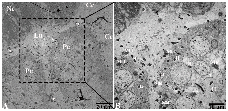 For the ultrastructural analysis, epididymis specimens during hibernation period were separated and cut into small parts (1 mm3) and fixed in 2.5% (v/v) glutaraldehyde in 0.1 M phosphate-buffered saline (PBS;4°C, pH 7.4; overnight). Thereafter they were post-fixed with 1% (w/v) osmium tetroxide cold at 4°C temperature in the same buffer for 1 h and washed in buffer. The samples were dehydrated in increasing concentrations of ethanol and infiltrated with a propylene oxide-Araldite mixture for embedding in Araldite. The blocks were sectioned, and ultrathin sections (50 nm) were mounted on Formvar-coated grids and stained with uranyl acetate and Reynolds lead citrate for 20 min per step. The sections were analyzed by transmission electron microscopy (TEM) (Hitachi H-7650; Japan) at an accelerating voltage of 80kV.