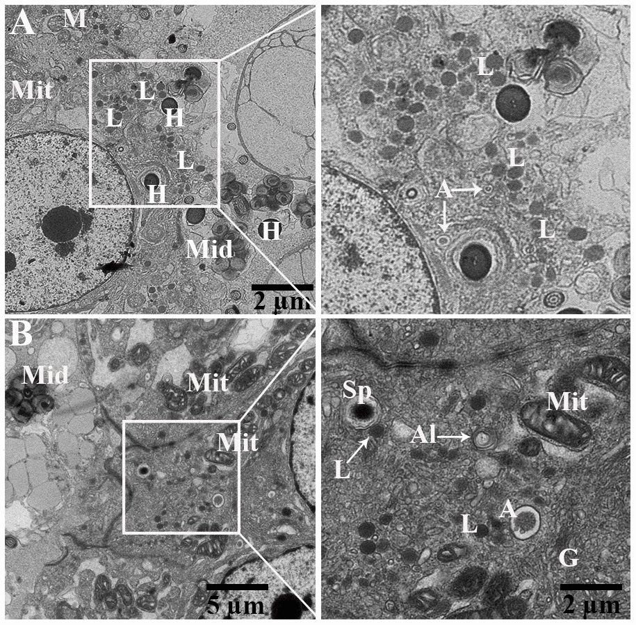 Detail ultrastructural study was performed during hibernation to characterize the autophagic phagocytosis in the epididymal epithelia. TEM results showed that the epididymis consists of various cells such as principal cells, clear cells, and narrow cells, and numerous spermatozoa were in the lumen of the turtle epididymis. Detailed TEM observations (Figure 6) indicated that various sperm segments (head, midpiece and tail) were scattered within the cytoplasm of principal cells while in the lumen, some spermatozoa were associated with the apical border of principal cells (Figure 6A, 6B). Furthermore, within the apical cytoplasm of principal cells, numerous lysosomes, mitochondria, Golgi complex, vacuolization, and segments of phagocytosed spermatozoa were seen. Lysosomal and autophagic activity were also readily observed (Figure 7A, 7B).