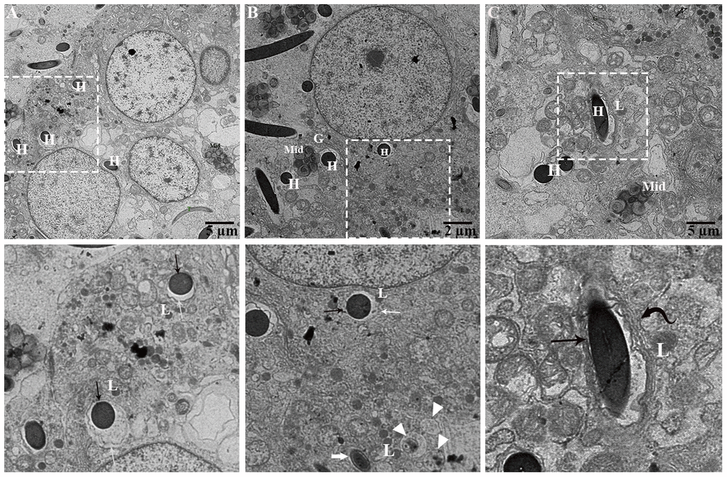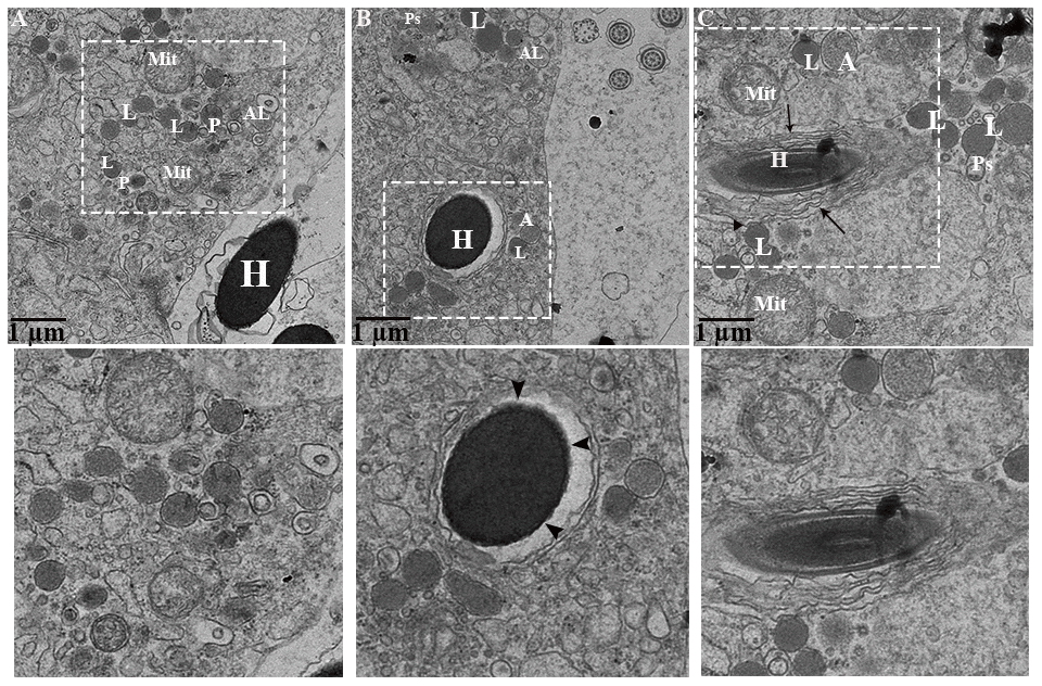 During phagocytosing, segments of spermatozoa have become contained within vacuoles that are separated from the principal cell cytoplasm by an electron lucent space. On the other side, the principal cell cytoplasm exhibited no distinct space but direct attachment with the plasma membrane of the vacuolated segment of spermatozoa (Figure 8A). These two zones represented as two concentric layers around the sperm segment inside the principal cytoplasm (Figure 8A–8C). Interestingly, lysosomal activity (lysosomes, engulfment by lysosome and phagolysosome) and autophagy (autophagosome and autolysosome) can also be observed (Figure 9A). It was observed that the degradation occurred in the head segment of phagocytosed spermatozoa, which is no more resistant to the degradation as shown in the Figure 9B, 9C, the disruption in the nuclear plasma membrane. Under TEM, it is characterized by the formation of membranous concentric layers around the head segment and acrosomal sheath. As phagocytosis processes, the concentric layer disappears and finally there is direct contact between principal cytoplasm and the spermatozoa. Moreover, we also observed direct attachment of the lysosome and the concentric layers around the phagocytosed segment of spermatozoa and existence of autophagy component (autophagosome and autolysosome) (Figure 9). Ultrastructure results suggest that spermiophagy is active during sperm storage within the principal cells of epididymis. Spermiophagy is characterized by membranes concentric layers around the phagocytosed segment of spermatozoa and direct attachment of lysosome for engulfment with the autophagic activity.