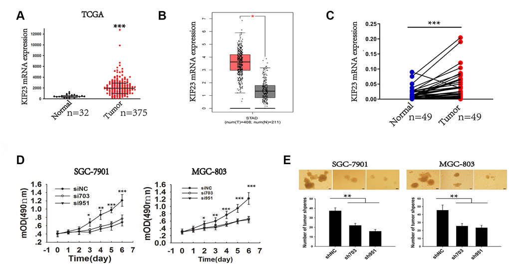 To further verify the role of KIF23 in GC pathogenesis, two Gene Expression Omnibus (GEO) (GSE2685 and GSE65801) and The Cancer Genome Atlas (TCGA) datasets were chosen for evaluation of KIF23 mRNA levels in GC and normal tissues. The results of datasets showed that KIF23 was significantly upregulated in GC tumors compared with normal tissues, especially in proliferative GC samples (Figure 1A, 1B and Supplementary Figure 1A, 1B). We also analyzed KIF23 levels in GC and normal tissues collected from Xinhua Hospital, and the results were consistent with the dataset analysis (Figure 1C). Similarly, assessment via immunohistochemistry (IHC) revealed that KIF23 was upregulated in GC tumors compared with matched adjacent histologically normal tissues (MN) and histologically normal tissues (NN). In addition, KIF23 expression was markedly upregulated in tumors from patients with phase III GC compared with samples from phase II and I patients (Supplementary Figure 1C and 1D). And higher KIF23 expression in GC patients was correlated with shorter survival times, which was consistent with the analysis of publicly available datasets (http://kmplot.com/analysis/index.php?p=service&cancer=gastric) (Supplementary Figure 1E and 1F).