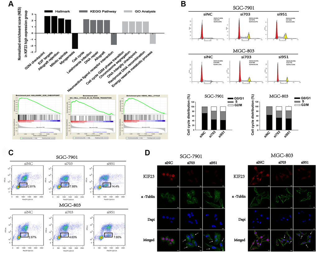 To explore the mechanism by which KIF23 regulates cell proliferation, we carried out gene set enrichment analysis (GSEA) using public datasets (GSE65801), and the results showed that high KIF23 expression was positively associated with cell cycle progression (Figure 2A). Subsequently, we monitored cell cycle progression using FACS after KIF23 knockdown. Interestingly, a higher proportion of cells transfected with siRNA-KIF23 were arrested at the G2/M phase of the cell cycle than that of cells transfected with siNC (Figure 2B and2C). This finding suggested that KIF23 may participate in regulating cell cycle progression in GC cells. Furthermore, the effect of KIF23 knockdown on the shapes of these cells was examined by confocal microscopy. Typical fluorescent images of the stained cells are shown in Figure 2D. An increased number of KIF23 siRNA-treated GC cells exhibited large cell bodies with two nuclei. The KIF23 siRNA-treated GC cells may not have been able to complete cytokinesis properly; therefore, these cells were arrested in the G2/M phase of the cell cycle.