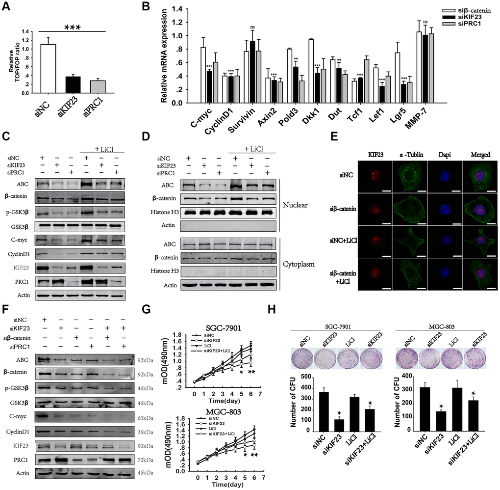 Oncogenic activation of the Wnt/β-catenin signaling pathway is common in GC. To investigate the potential role of KIF23 in the Wnt/β-catenin signaling pathway, we first determined the effect of KIF23 on T cell factor (TCF) activity in GC cells. Unexpectedly, KIF23 knockdown significantly inhibited TCF luciferase reporter activity in MGC-803 cells. TCF luciferase reporter activity was also substantially impaired in PRC1-siRNA-treated cells, as previous reported (Figure 3A). PRC1 is a MAP regulator of cytokinesis and could precipitate with KIF23. We further studied the effect of KIF23 on the expression of 11 reported Wnt targets by real-time PCR with specific primers (Supplementary Table 1). KIF23 knockdown significantly inhibited the expression of 9 out of the 11 Wnt targets, and β-catenin or PRC1 knockdown also inhibited most of the 11 Wnt targets (Figure 3B). Western blot analysis confirmed these results and demonstrated that silencing KIF23 markedly suppressed the Wnt/β-catenin signaling pathway by decreasing ABC, β-catenin, p-GSK3β and Wnt target expression in MGC-803 cells, which was partly rescued by LiCl (Figure 3C and Supplementary Figure 5A). PRC1 silencing had the same effects on the Wnt/β-catenin signaling pathway as KIF23 knockdown. However, KIF23 knockdown increased PRC1 expression. Therefore, we combined KIF23 siRNA with β-catenin or PRC1 siRNA to recover the expression of PRC1. Figure 3F showed that ABC, p-GSK3β and Wnt target expression was significantly suppressed after combination of KIF23 siRNA with β-catenin or PRC1 siRNA. Based on the observed effects of KIF23 silencing on activated β-catenin levels, we further investigated the effect on the nuclear distribution of β-catenin. The results obtained from cytoplasmic and nuclear protein extraction and immunofluorescence indicated that KIF23 knockdown impaired the nuclear accumulation of β-catenin (Figure 3D and 3E). Reduction of β-catenin by siKIF23 may also be at the protein level, as it could be blocked by proteasome inhibitor MG132. And KIF23 silencing mediated β-catenin degradation is a proteasome-dependent and ubiquitination-dependent (Supplementary Figure 5B and 5C). Moreover, the inhibition of cell proliferation and colony formation caused by KIF23 siRNA was rescued by LiCl (Figure 3G and 3H), indicating that KIF23 regulates the oncogenic effects of the Wnt/β-catenin signaling pathway. On the other hand, to identify the effect of the Wnt/β-catenin signaling pathway on KIF23, we analyzed the expression of KIF23 after treatment with β-catenin siRNA or LiCl. We found that silencing of β-catenin and activation of the Wnt/β-catenin signaling pathway did not affect the expression and distribution of KIF23 (Supplementary Figure 6).