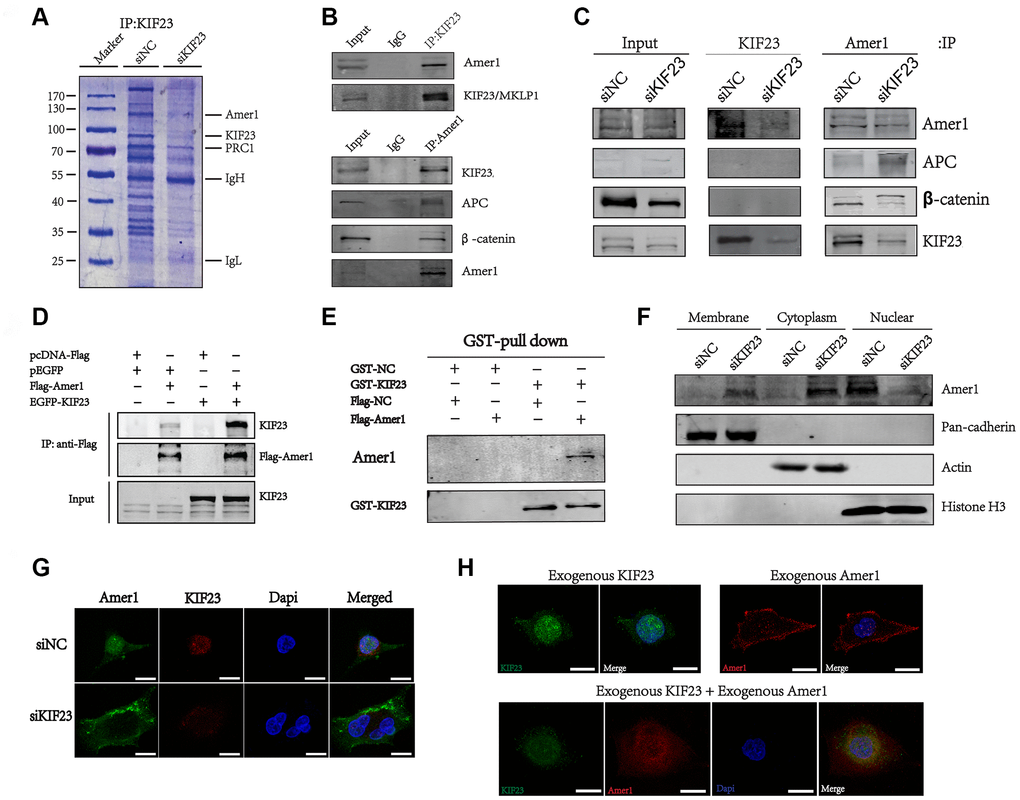 To our knowledge, no direct target of KIF23 has been reported previously. To identify KIF23 target proteins that may account for the activation of the Wnt/β-catenin signaling pathway, we first used mass spectrometry to identify proteins that bind directly with KIF23, and Amer1 was identified as a putative protein involved in KIF23-mediated activation of the Wnt/β-catenin signaling pathway (Figure 4A and Supplementary Figure 8). To further confirm the interaction between KIF23 and Amer1, we performed coimmunoprecipitation (Co-IP) and GST-pull-down experiments and found that endogenous KIF23 as well as exogenous wild-type KIF23 could be specifically coimmunoprecipitated with Amer1 (Figure 4B–4E). Immunofluorescence staining and Western blotting showed that Amer1 localized to the nuclei instead of the plasma membrane, but transferred to the plasma membrane after KIF23 was silenced in MGC-803 (Figure 4F and 4G). Consistent with the above results, exogenous Amer1 was also enriched in nuclei after cotransfection with a KIF23 overexpression plasmid (Figure 4H).