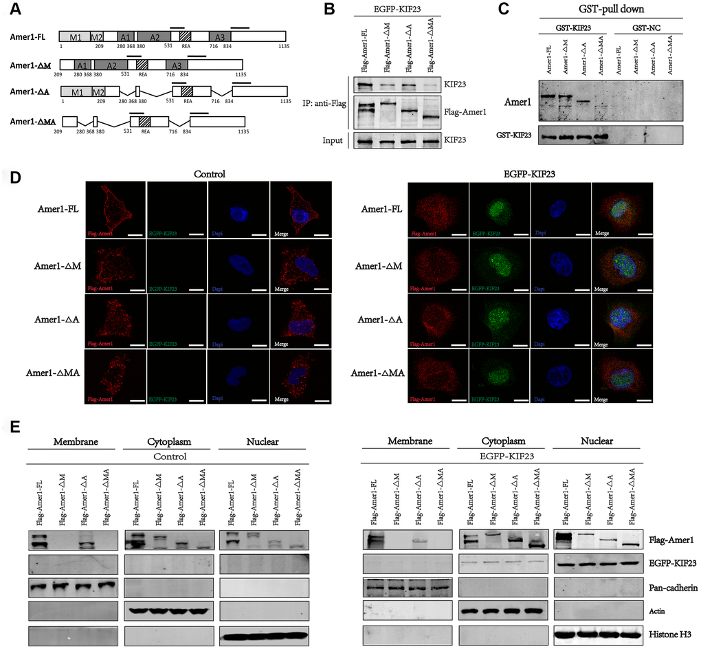 Furthermore, we constructed full-length Amer1 and three truncated mutants fused to the FLAG tag and Ds-red fluorescent protein. These constructs were tentatively termed Amer1-FL (full-length Amer1), ∆M (lacking the N-terminal membrane localization domains, MLD), ΔA (lacking the APC-binding domains, ABD) and ΔMA (lacking the membrane localization domains and APC-binding domains) (Figure 5A). Then, Co-IP and GST-pull-down assays were performed, and the results showed that all the Amer1 constructs except Amer1-ΔMA immunoprecipitated with KIF23, suggesting that KIF23 binds with Amer1 within the membrane localization domains and APC-binding domains (Figure 5B and 5C). Notably, cotransfection of the KIF23 plasmid with Amer1-FL led to Amer1 being transferred from the plasma membranes to the nuclei, but the levels of Amer1 in the nuclei were relatively low in the groups cotransfected with the KIF23 plasmid and Amer1-ΔM, ΔA, or, especially ΔMA (Figure 5D and 5E). Thus, the competitive binding of KIF23 with MLD and ABD within Amer1 interfered with the interaction between Amer1 and APC and with the distribution of Amer1, thus attenuating the ability of Amer1 to negatively regulate the Wnt/β-catenin signaling pathway.