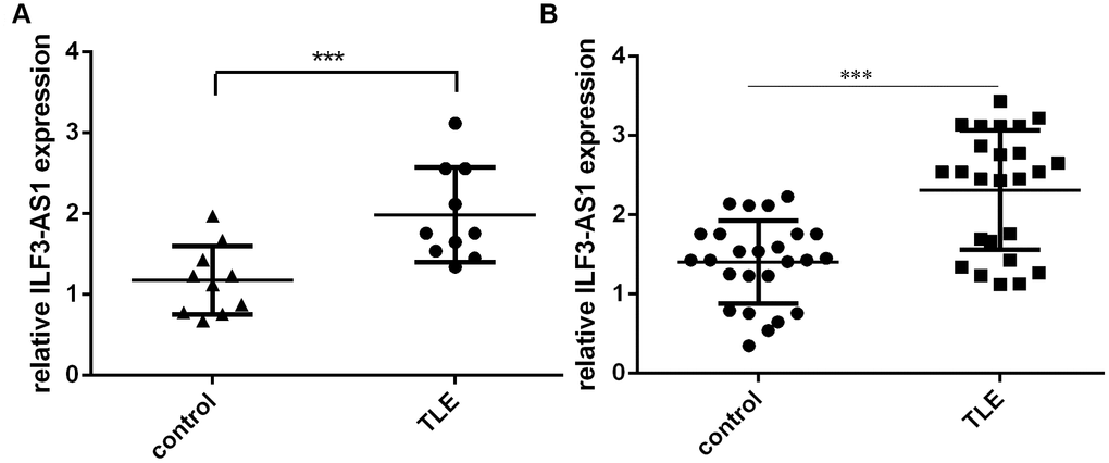 We first analyzed ILF3-AS1 expression in the hippocampus of TLE and control patients. As indicated in Figure 1A, hippocampal ILF3-AS1 expression was higher in the TLE group than in the control group. Additionally, our results showed that serum ILF3-AS1 levels were also higher in TLE than control group (Figure 1B).