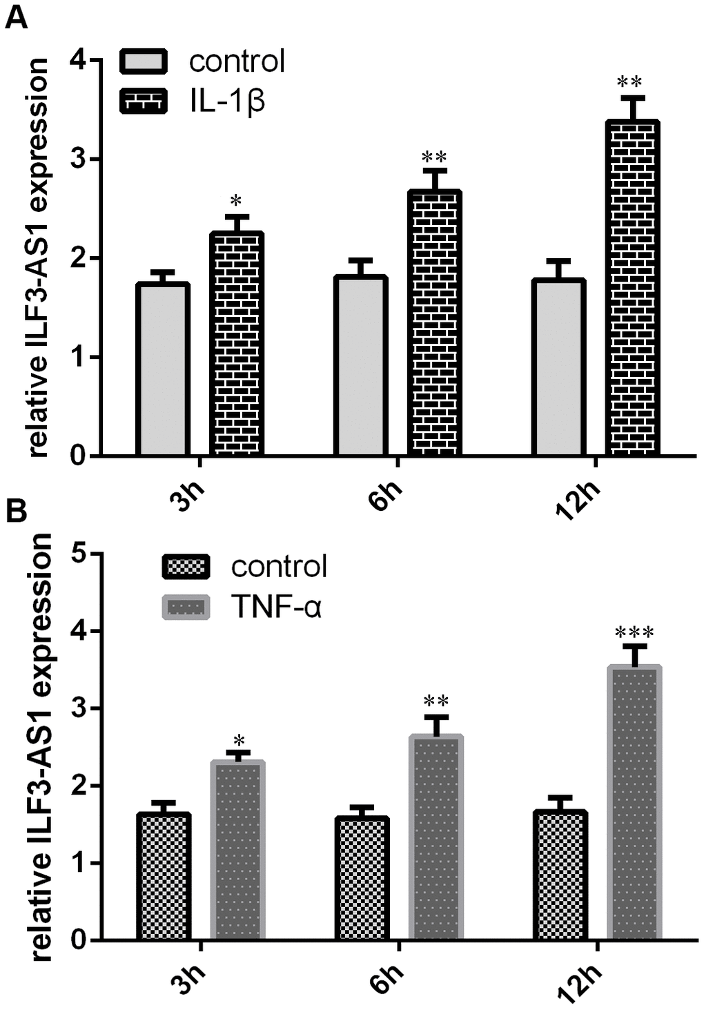 To study the effects of inflammatory cytokines on ILF3-AS1 expression in TLE, astrocytes were treated with IL-1β or TNF-α. Our data revealed that IL-1β and TNF-α were each able to induce ILF3-AS1 expression in the astrocytes (Figure 2A and 2B).