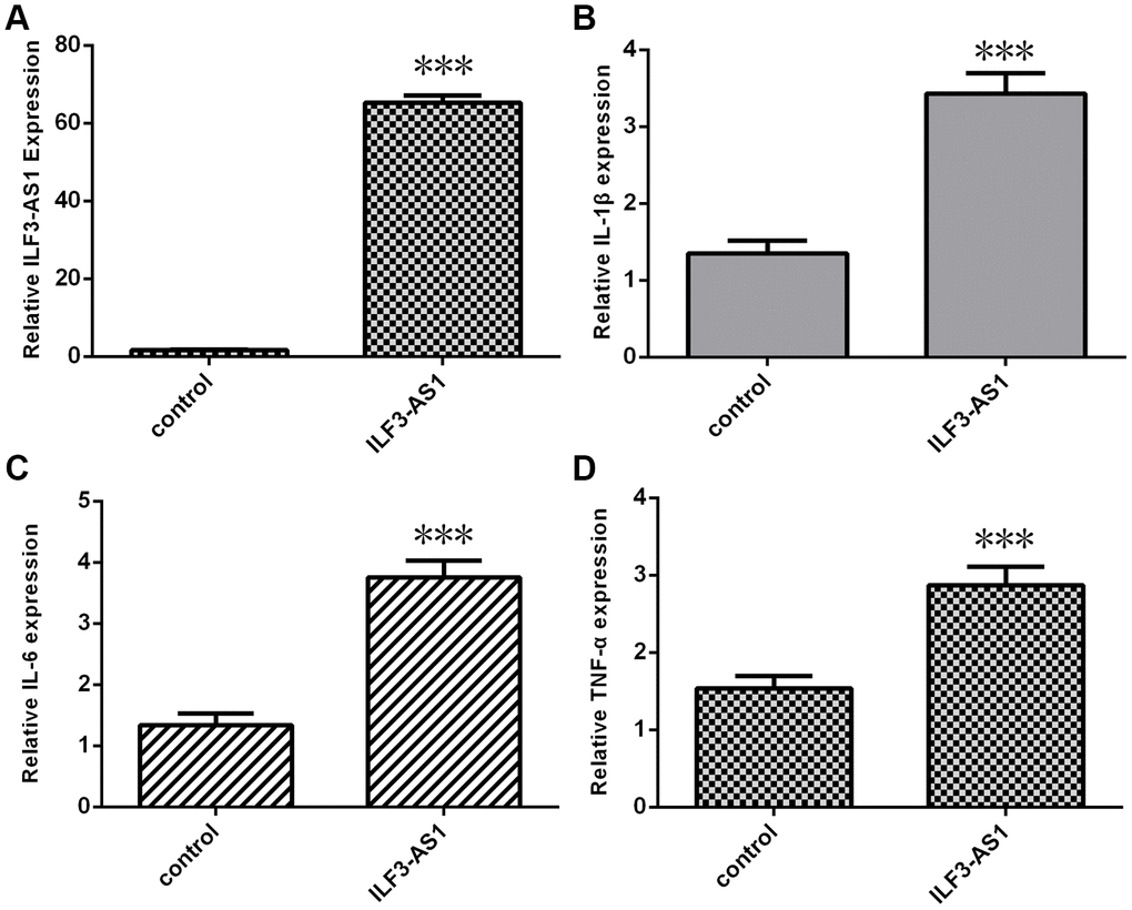 To further explore the relation between ILF3-AS1 and inflammatory cytokines in TLE, astrocytes were transfected with the pcDNA-ILF3-AS1 plasmid, which led to overexpression of ILF3-AS1 in the transfectants (Figure 3A). Notably, this ectopic ILF3-AS1 expression also promoted expression of IL-1β (Figure 3B), IL-6 (Figure 3C) and TNF-α in the astrocytes (Figure 3D).