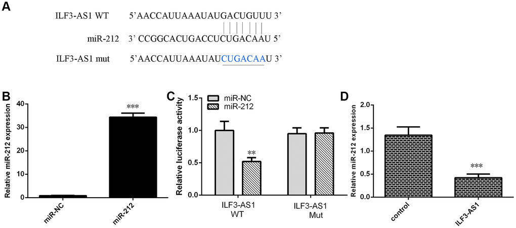 A Trizol kit was used to isolate RNA from cells and specimens. qRT-PCR assays were applied to determine the levels of ILF3-AS1, miR-212 and mRNA expression on an iQ5 qRT-PCR System (Bio-Rad, Hercules, CA) using SYBR Green (Takara Biotechnology, Dalian, China). U6 or GAPDH was utilized as the normal control. Expression level was determined using the 2−ΔΔCt method. The primers utilized in this research were as follows: for ILF3-AS1, 5′-TAAACCCCACTGTCTTCC-3′ (forward) and 5′-TTCCTTGCTCTTCTTGCTC-3′ (reverse); for miR-212, 5′-TGGTGTAACAGTCTCCAGTCA-3′ (forward) and 5′-CGATGACCTATGAATTGACAGACG-3′ (reverse); and for GAPDH, 5′- CACCGTAGCCT TCCGAGTA-3′ (forward) and 5′-GCCCTTGATG AGCTGTTGA-3′ (reverse).