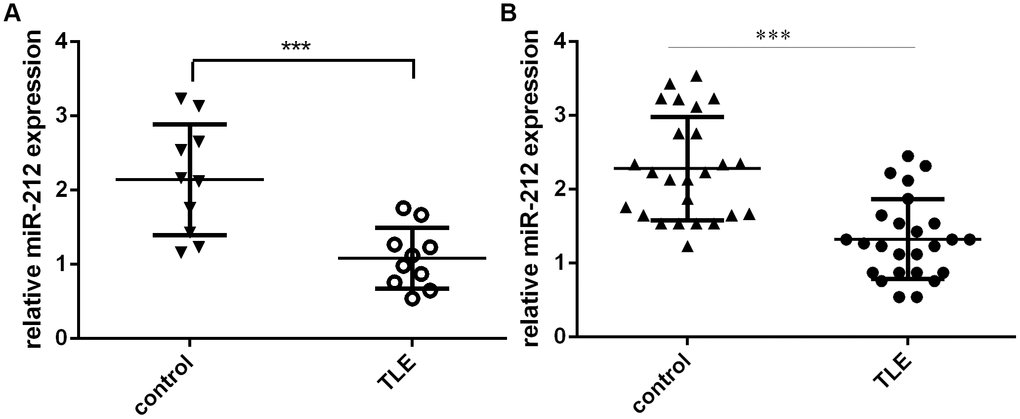 To investigate the molecular mechanism by which ILF3-AS1 may contribute to TLE progression, we analyzed its interactome using Starbase (http://starbase.sysu.edu.cn/index.php), which predicted that ILF3-AS1 likely binds miR-212 (Figure 5A). We also showed that miR-212 expression was increased in astrocytes treated with miR-212 mimic (Figure 5B). Using luciferase reporter assays, we observed that miR-212 overexpression decreased luciferase activity in astrocytes transfected with a wild-type ILF3-AS1 reporter plasmid (Figure 5C). Conversely, forced ILF3-AS1 expression suppressed miR-212 expression in the cells (Figure 5D). Consistent with those findings, both hippocampal and serum miR-212 levels were lower in TLE patients than the control group (Figure 6A and 6B).
