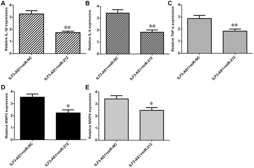 To determine whether ILF3-AS1 promotes expression of inflammatory cytokines and MMPs by suppressing miR-212, a series of rescue experiments were performed. Forced miR-212 expression reduced expression of IL-1β (Figure 7A), IL-6 (Figure 7B), and TNF-α (Figure 7C) in astrocytes overexpressing ILF3-AS1. Likewise, elevated miR-212 expression decreased expression of MMP3 (Figure 7D) and MMP9 (Figure 7E) in the ILF3-AS1-overexpressing cells.