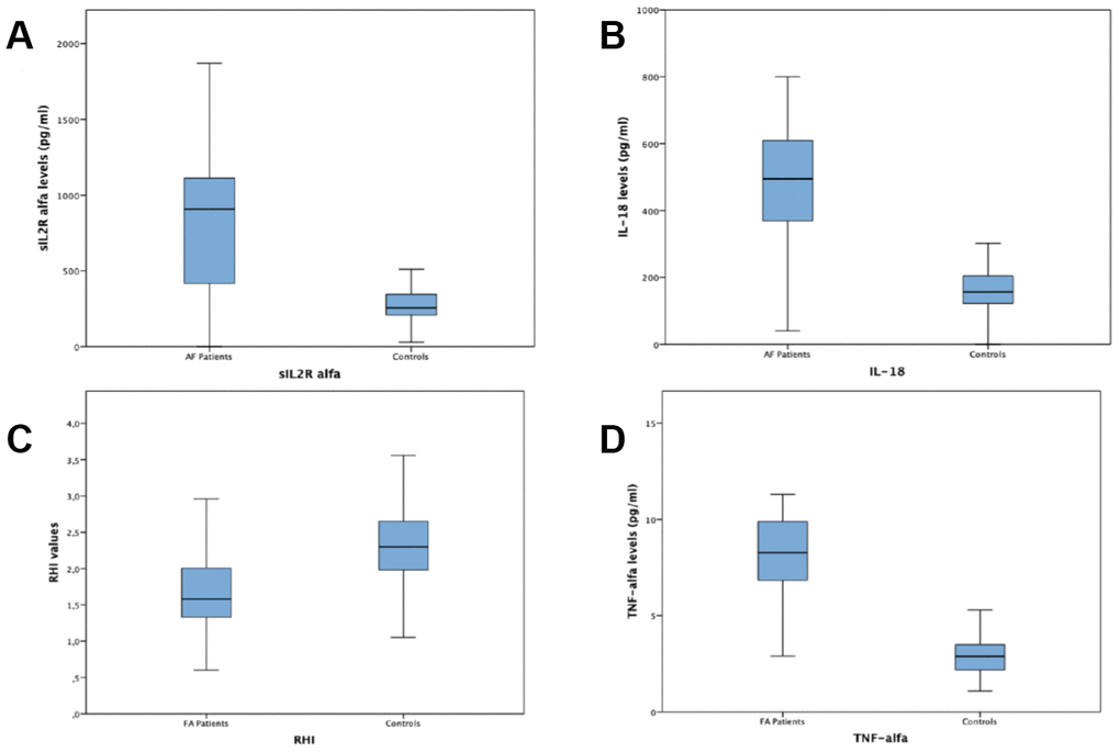 Blood samples were collected from the antecubital vein after 10 minutes of rest in the supine position. In the AF cohort blood samples were withdrawn while the patients were in AF rhythm. We evaluated circulating plasma levels of soluble Interleukin 2 Receptor Alpha (sIL-2Rα), TNF-α and IL-18. sIL-2Rα and TNF-α were measured in plasma by ELISA (R&D Systems, Minneapolis, MN, USA); IL-18 were measured using a commercial sandwich ELISA (MBL, Medical and Biological Laboratories Co., Ltd, Nagoya, Japan). The minimum detectable concentrations for the diagnostic tests are: sIL-2Rα: 312 – 20,000pg/mL; IL-18: 12.5 pg/ml; TNF-α: 0.191 pg/mL. Intraassay and interassay coefficients of variation were: sIL-2Rα: 5,11-7,59%; IL-18: 10 -15 %; TNF-α 5.2-8.5%