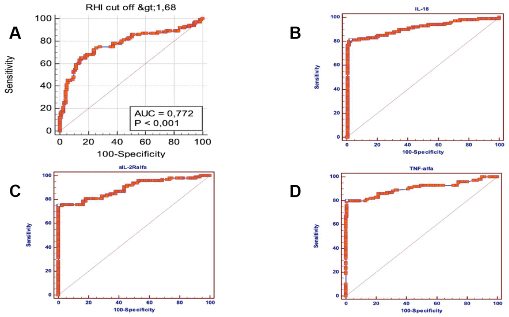 A Multiple logistic regression model, including all the significant baseline variables (P<0.05) predictive of AF, showed that RHI (OR=5.94; 95% CI = 0.93- 20.78; p = 0.053), IL- 18 (OR = 1.01; 95% CI = 1-1.019; p = 0.042), TNF α (OR = 5.1; 95% CI = 1.35-19.18; p = 0.016), sIL-2Rα (OR= 1.02; 95% CI = 1.007-1.038; p = 0.005) and hypertension (OR = 6,8; 95% CI = 2.1-20.98; p = 0.003) were independently associated with the arrhythmia (Table 3). Moreover ROC curves identified the best cut-offs of RHI (AUC =0.772; p = 0.0001; sensitivity =65%, specificity = 85%, cut-off value ≤ 1.75), IL-18 (AUC=0.906; p= 0.0001; sensitivity = 81%, specificity = 97.52%, cut-off value> 269.9), TNF-α (AUC = 0.904, p = 0.0001; sensitivity = 80%, specificity = 99.17%, cut-off value> 5, 55), sIL-2Rα (AUC = 0.895; p = 0.0001; sensitivity = 74.75%, specificity = 100%, cut-off value> 511) for the presence of AF (Figure 2).