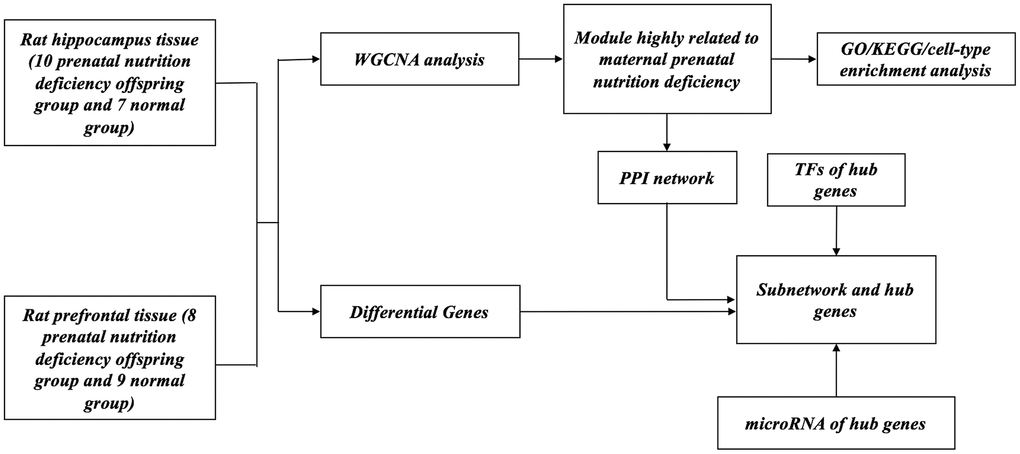 Animal-based research showed that maternal prenatal nutrition deficiency is closely related to the neurodevelopment of offspring [6, 7]. Protein malnutrition has been extensively studied as an important research direction of maternal malnutrition during pregnancy. We have established a prenatal malnutrition (famine) rat model, named RLP50, which was induced by prenatal exposure to a diet restricted to 50% of a low-protein (6%) [8]. Using gene expression and DNA methylation modifications profiling strategies, we have observed significantly different patterns of gene expression and trace elements in pregnant rats of the RLP50 group. This broadens our understanding of the complex biochemical perturbations that prenatal exposure to famine can induce, and these perturbations may eventually lead to impairment of fetal neurodevelopment [8]. However, these studies emphasized only on screening differentially expressed biomarkers rather than determining the connection between them, in which biomarkers with similar expression patterns may be functionally related. Moreover, the regulatory interactions between genes in particular pathways or biological processes responding to the prenatal nutritional deficiency have not been investigated. Additionally, potential novel regulators of transcription and post-transcription dominating prenatal nutritional deficiency-induced gene expression changes, including micro-RNAs, long noncoding RNAs, and transcription factors, have not been investigated how they regulate the transcription-level RNA interactions. Thereby understanding the functional molecular mechanisms regulated by these interactions is essential for gaining biological insights into gene functions. Transcriptomic network analysis enables us to cluster genes by assigning them to known biological functions in which they are involved [9]. Among the transcriptomic network inference algorithms, weighted gene co-expression network analysis (WGCNA) is a relatively new statistical method not only to infer correlation patterns between two genes but also covers neighborhood across expression data through constructing subnetworks named modules [10]. Plenty of evidence suggested the modules as stable units underlying transcriptional regulation networks whose function can remain the same while individual gene expression can be changed or replaced by other genes with similar redundant functions [11].