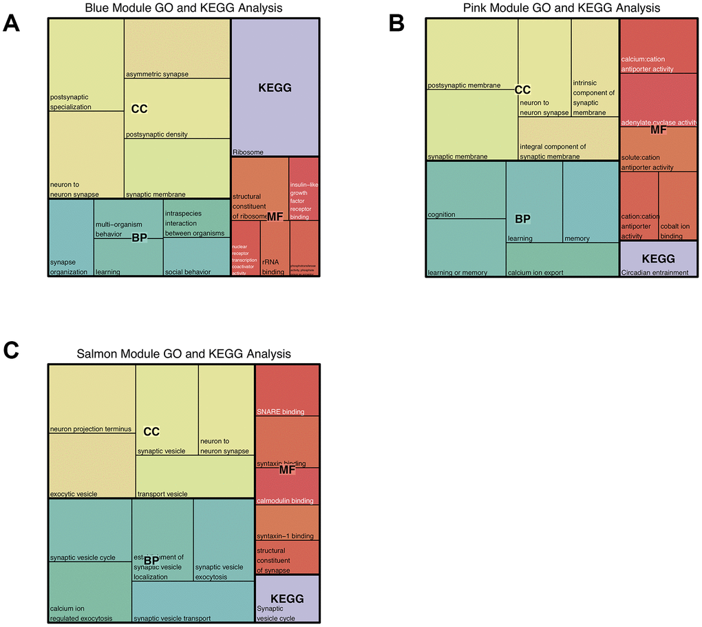 KEGG enrichment analysis demonstrated that the genes within the blue, pink, and salmon modules were involved in the ribosome, circadian entrainment and synaptic vesicle cycle, respectively (Figure 3, Supplementary Table 6). This further indicated that the salmon module genes are more closely related to synaptic development.