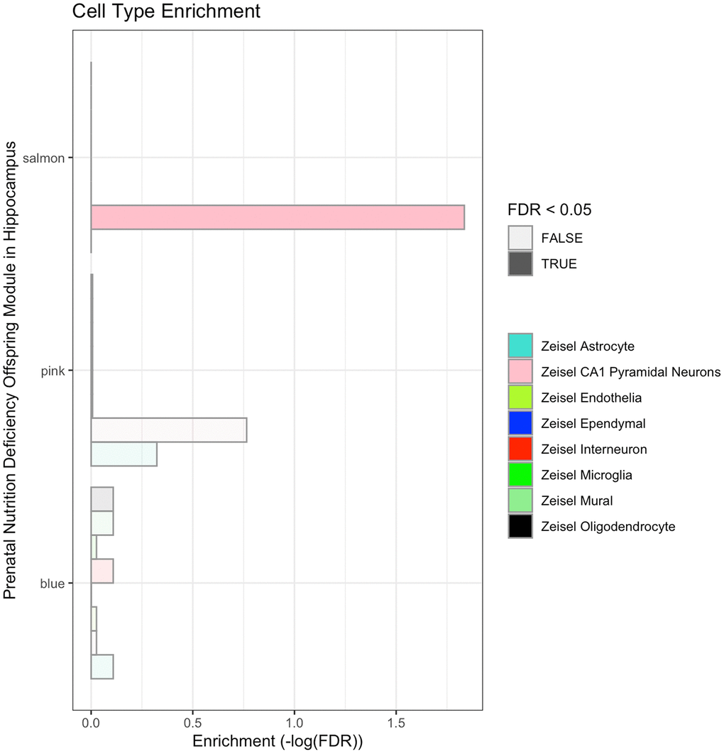 Network analysis screened out three modules associated with prenatal malnutrition in the hippocampus, including blue, pink and salmon one (Figure 2A). The GO and KEGG analysis suggested genes in these modules were involved in synaptic development, neuronal projection, cognitive function, and learning function. Cell-types analysis showed that salmon module significantly enriched hippocampal CA1 pyramidal neurons (Figure 4, Supplementary Table 7). The abundance of pyramidal neurons in the hippocampus suggests that their proper function is necessary for cognitive processing, and thus defects in pyramidal neuron function could be a reason for the cognitive impairment in neuropsychiatric disorders, such as Alzheimer’s disease or schizophrenia [26]. Overlap analysis of genes associated with major brain diseases demonstrated that dysregulated genes associated with Alzheimer's disease, autism, and schizophrenia were overrepresented. All these findings based on enrichment analysis demonstrated that these three modules in rat hippocampus represented the key gene regulatory networks and pathways related to the impact of prenatal malnutrition on neuropsychiatric diseases, including Alzheimer's disease, autism, and schizophrenia (Table 2).