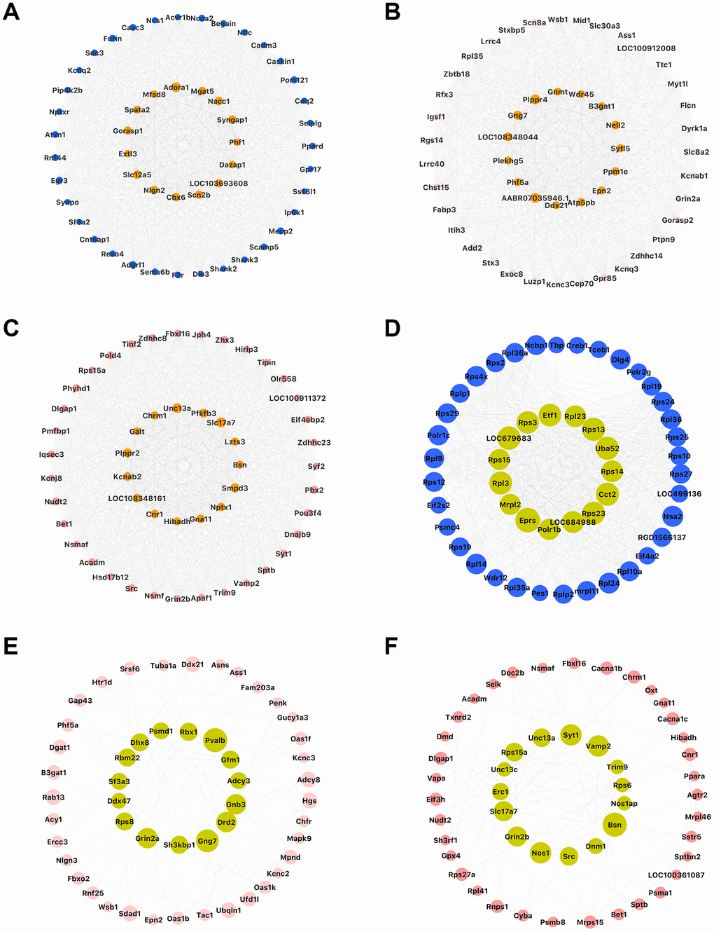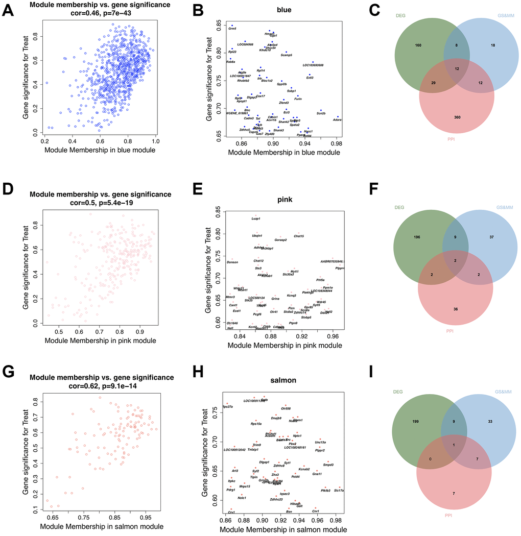 As shown in Figure 5A, 5D and 5G, the Factor-associated down-regulated blue, pink and salmon modules were significant positive correlations between GS and MM in the hippocampus. This showed that these three modules have high quality. We selected the top 50 genes in each of the three modules (Figure 5B, 5E, and 5H) with high GS and MM from blue, pink and salmon modules, (Supplementary Table 4) respectively. And we also showed the top 50 high connectivity genes based on the co-expression network, which may provide a basis for other studies (Figure 7A–7C, Supplementary Figure 6A–6C). We constructed PPI networks of these three module genes using STRING and highlighted the top 50 high connectivity genes (Figure 7D–7F, Supplementary Figure 6D–6F). Hub genes selection was based on features including significantly different between prenatal nutrition deficiency and control offspring, high GS and MM and connection degree ≥ 5 in the PPI network (Figure 5C, 5F, and 5I). We found twelve hub genes in the blue module, including Hmgn1, Ssbp1, LOC684988, Rpl23, Gga1, Rhobtb2, Dhcr24, Atg9a, Dlgap3, Grm5, Scn2b and Furin, two hub genes in the pink module, including Sh3kbp1 and Ubqln1, and one hub gene (Unc13a) in the salmon module (Supplementary Figure 7A).