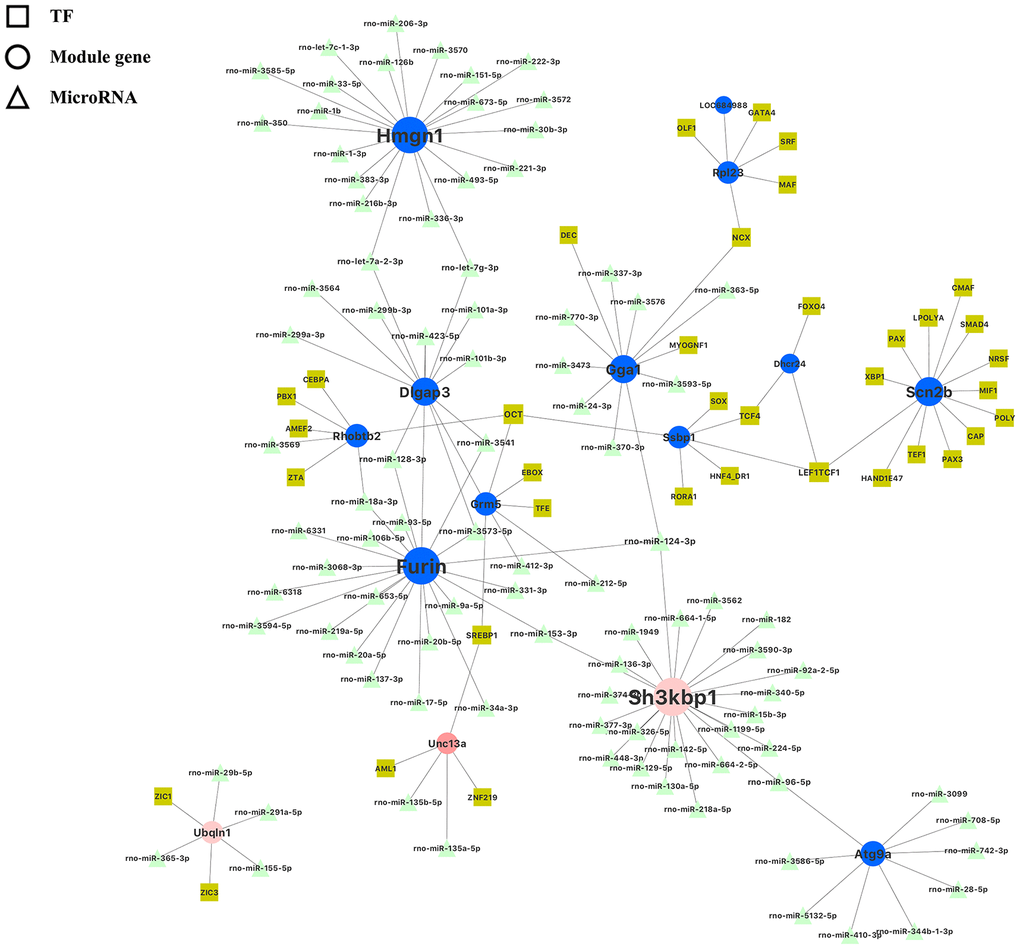 To explore transcription factors (TFs) and miRNA–mRNA interaction in particular modules and to predict the possible regulatory relationships between them that dominate prenatal nutritional deficiency-induced gene expression changes, we used two common online databases, respectively. The TFs that bind onto hub genes were screened using DiRE [50] (https://dire.dcode.org), a web server can predict common REs for any set of input genes. microRNAs of hub genes were screened using miRDB [51] (http://mirdb.org/mining.html). This database collected miRNA-genes regulatory relationships.