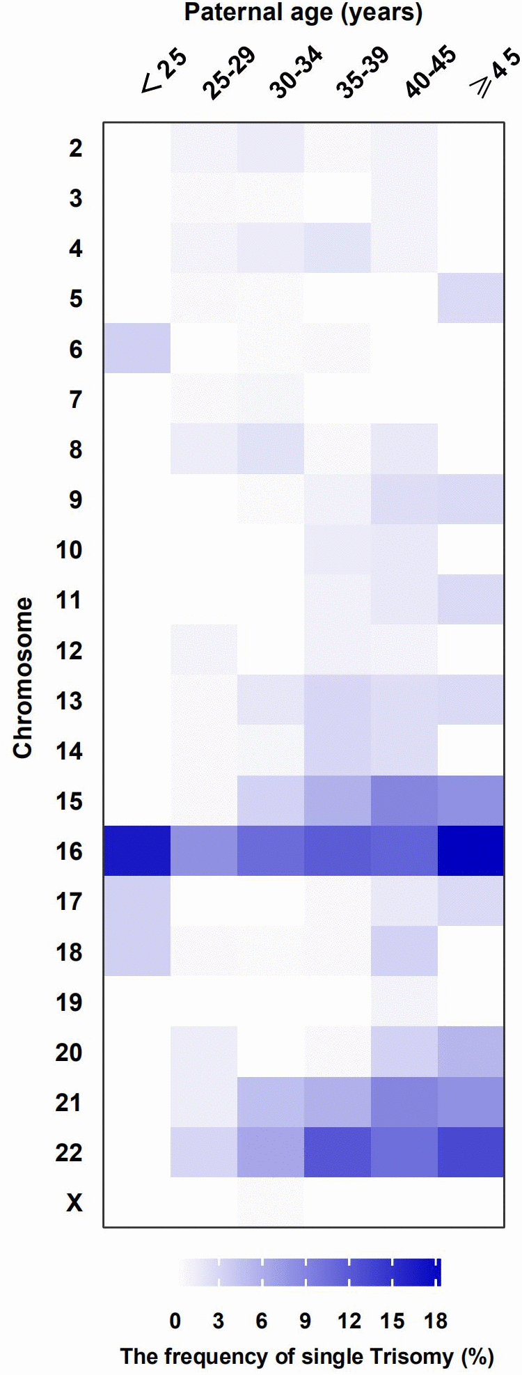 Table 2 shows the frequencies of different abnormal chromosomal karyotypes in the miscarried fetuses between different paternal age groups were compared. The SNP array analysis shows abnormal karyotypes in 60.2% (557/925) of the chorionic villi from miscarriages. The most common abnormality was trisomy, accounting for 73.1% (407/557) of all identified abnormalities. Among the trisomy cases, 89.9% (366/407) were single chromosome trisomies and 5.2% (21/407) were multiple trisomies (where two or more chromosomes are involved). Microdeletions or microduplications were observed in the remaining 4.9% (20/407) of trisomy cases. Among the single-chromosome trisomies, the most prevalent was trisomy 16 (100/366; 27.3%), followed by trisomy 22 (69/366; 18.9%) and trisomy 21 (42/366; 11.5%). The prevalence of trisomy, especially in chromosomes 16, 22, and 21, increased with paternal age. However, it should be noted that the prevalence of trisomy 6, 16, 17, and 18 were observed a slighter increase for the youngest male age group (Figure 1).