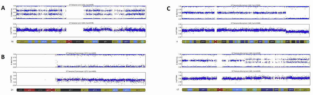 Monosomy was found in 5.7% of samples (32/557), of which, 81.3% (26/32) were on the X-chromosome and 18.8% (6/32) were on autosomal chromosomes. Chromosomal structural abnormalities were found in 9.0% of the samples (50/557), of which, 88.0% (44/50) were duplications or deletions, and 12.0% (6/50) were complex abnormalities. Triploidy was found in 5.9% of samples (33/557) and mosaicism was found in 6.3% of samples (35/557). Representative examples of SNP results are shown in Figure 2.
