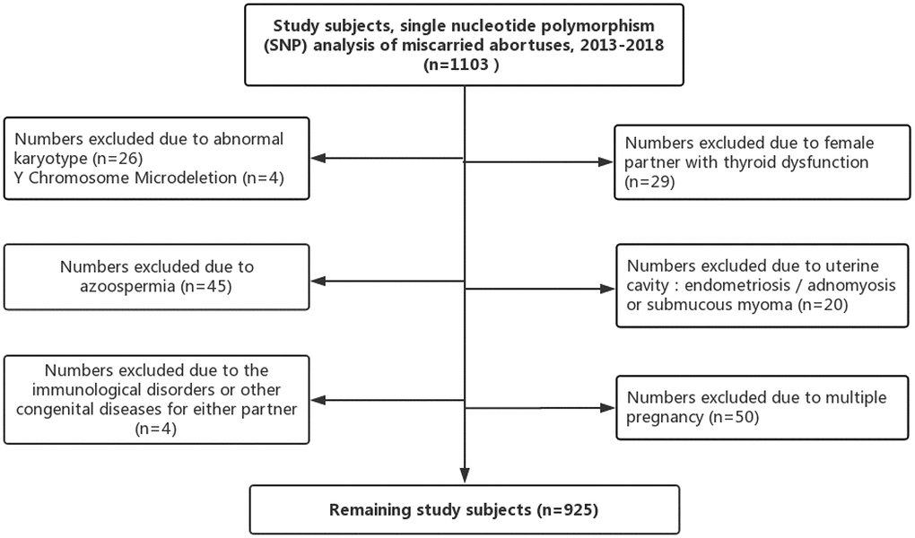 The database included clinical information regarding 1103 patients who experienced involuntary miscarriage between January 2013 and December 2018 in our fertility clinic after ART. The patients sent their miscarried fetuses to our pre-implantation genetic diagnosis center for analysis. As shown in Figure 3, we excluded patients with abnormal chromosome karyotype for either partner (30 patients), uterine factors such as endometriosis, adenomyosis or submucous myoma (20 patients), female partner with thyroid dysfunction (29 patients), multiple pregnancy (50 patients), immunological disorders or other congenital diseases for either partner (4 patients), non-obstructive or obstructive azoospermia (45 patients), and factors related to infectious agents (0 patients). We obtained all clinical information of the study couples, including the ART process that they underwent and evaluated the relationship between miscarriage due to chromosomal abnormalities and paternal characteristics such as paternal age, BMI, and semen parameters.