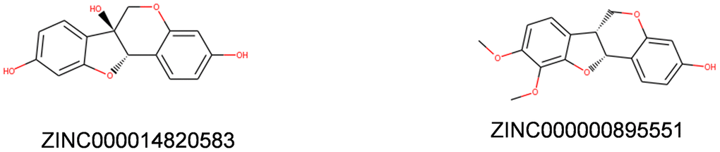 Safety and toxicity should also need full consideration in this study. To confirm the safety of the top20 compounds, different kinds of toxicity indicators of these compounds and Bestatin, including rodent carcinogenicity (based on the U.S. National Toxicology Program dataset), developmental toxicity potential properties, Ames mutagenicity were predicted by using a computational method in the TOPKAT module of Discovery Studio 4.5 (Table 3). Results indicated that 13 compounds were found to be nonmutagenic, and 2 compounds showed not to have developmental toxicity potential(DTP), while one compound, ZINC000000895551, had little DTP. The reference Bestatin was predicted to have low rodent carcinogenicity and low DTP. Considering all the results in Table 3, ZINC000000895551 and ZINC000014820583 were identified to be the ideal leading compounds with non-CYP2D6 inhibitors and less rodent carcinogenicity, together with Ames mutagenicity, and developmental toxicity potential compared with other compounds. Therefore, ZINC000000895551 and ZINC000014820583 were confirmed as safe drug candidates and were selected for the subsequent research (Figure 1).