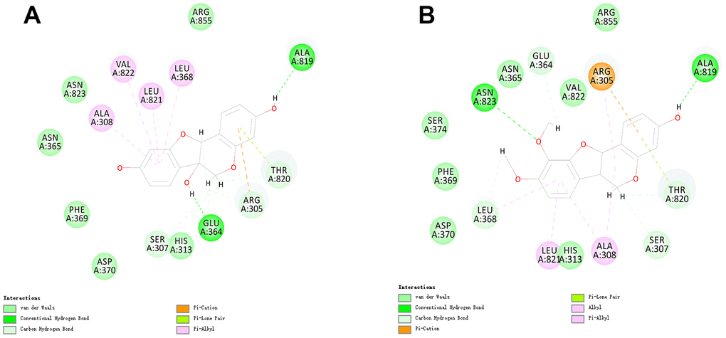 To identify ligand binding mechanisms of these compounds and Bestatin, ZINC000000895551 and ZINC000014820583 were docked into the molecule structure of CD13 using CDOCKER module, and CDOCKER potential energy was calculated and displayed in Table 4. RMSD between the docked pose and the crystal structure of the Bestatin and CD13 complex was 0.75 Å, proving that the CDOCKER module applied in this study was strongly reliable for reproducing the experiment. As results shown in Table 5, the CDOCKER potential energy of ZINC000000895551 and ZINC000014820583 were significantly lower than the reference ligand Bestatin (ZINC000001532730) (24.7496 kcal/mol), which suggested that these 2 compounds had a much higher binding affinity with CD13 than Bestatin. Hydrogen bonds and π-related interactions were also performed using structural computation study (Figures 2 and 3). Results showed that ZINC000000895551 formed 6 pairs of hydrogen bonds with CD13, by the H28 of the compound with ALA819:O of CD13, H32 of the compound with GLU364:OE2 of CD13, the O20 of the compound with ARG305:HD1, the H25 of the compound with GLU364:OE1, the H30 of the compound with SER307:OG and the H31 of the compound with THR820:O. Besides, 4 π-related interactions were formed in the complex, including the π-Orbitals between ZINC000000895551 and the ALA308, LEU368, LEU821, and VAL822 of CD13. ZINC000014820583 formed 6 pairs of hydrogen bonds with CD13, by the H34 of the compound with ALA819:O of CD13, the O9 of the compound with ASN823:HN of CD13, the H24 of the compound with LEU368:O of CD13, the H30 of the compound with GLU364:O of CD13, the H36 of the compound with SER307:OG of CD13 and the H37 of the compound with THR820:O of CD13. It also formed 5 pairs π-related interactions in the complex, consist of 2 pairs between ALA308 of CD13 and the compound, ARG305 of CD13 with the compound, LEU368 of CD13 with the compound, and LEU821 of CD13 with the compound. As to the reference compound Bestatin, it formed 2 hydrogen bonds with CD13, by the H38 of the compound with THR820:OG1 of CD13, and H36 of the compound with THR820:O of CD13. Also three π-related interactions formed between Bestatin and CD13, including ALA308, LEU368 and LEU821 of CD13 with Bestatin.