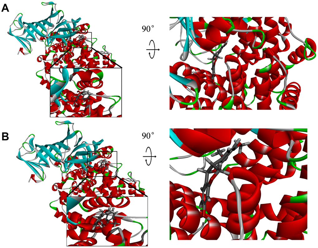The S1 pocket is an important regulatory site of CD13, as the Val (P1) side chain in the Ang IV complex binding to this active site could cause vasodilatation, hypertrophy, and stimulate NF-κB pathway, and then neovascularization occurs. Therefore, this pocket region was selected as a reference site. A total of 17,931 biogenic-for sale-named product molecules were taken from the ZINC15 database. Chemical structure of the receptor protein, CD13, was selected to test the pharmacologic properties of other compounds. One inhibitor, Bestatin, was chosen as the reference compound. After screening, 4761 compounds were found to be eligible to bind stably with CD13; among those, 318 compounds were found to have higher LibDock scores than Bestatin. (LibDock score: 97.2164), which are listed in Supplementary Table 1. The top 20 ranked compounds are listed in Table 1.