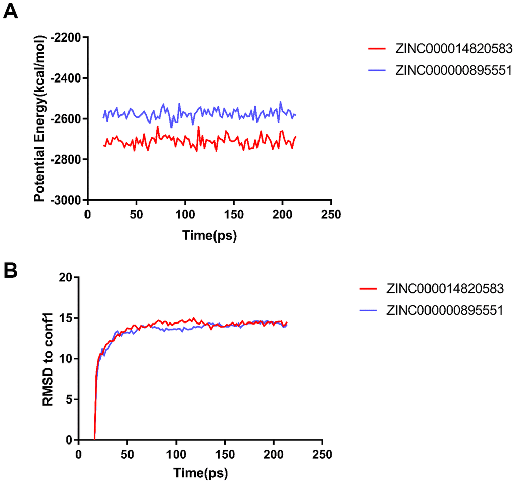 Finally, their stabilities in the natural environment were assessed performing molecular dynamics simulation. Computational results of RMSD and potential energy of these ligand-CD13 complexes showed that the trajectories of complexes reached equilibrium after 18 ps. RMSD and potential energy of these complexes tends to stability with time, which suggested that these 2 complexes could exist in the natural environment stably. Based on these results, drug designation and development, such as modification and refinement, could be prospectively carried out to make combination of ligand and receptor more stable. Moreover, it is also noteworthy that agonist and inhibitor always share a similar chemical skeleton structure, and adding or deleting different groups or atoms leads the opposite effects. As a result of their significantly pharmacologic properties, highly binding affinity and stabilization combining with CD13, natural compounds identified in this research could provide a valuable resource for CD13-related drug development.